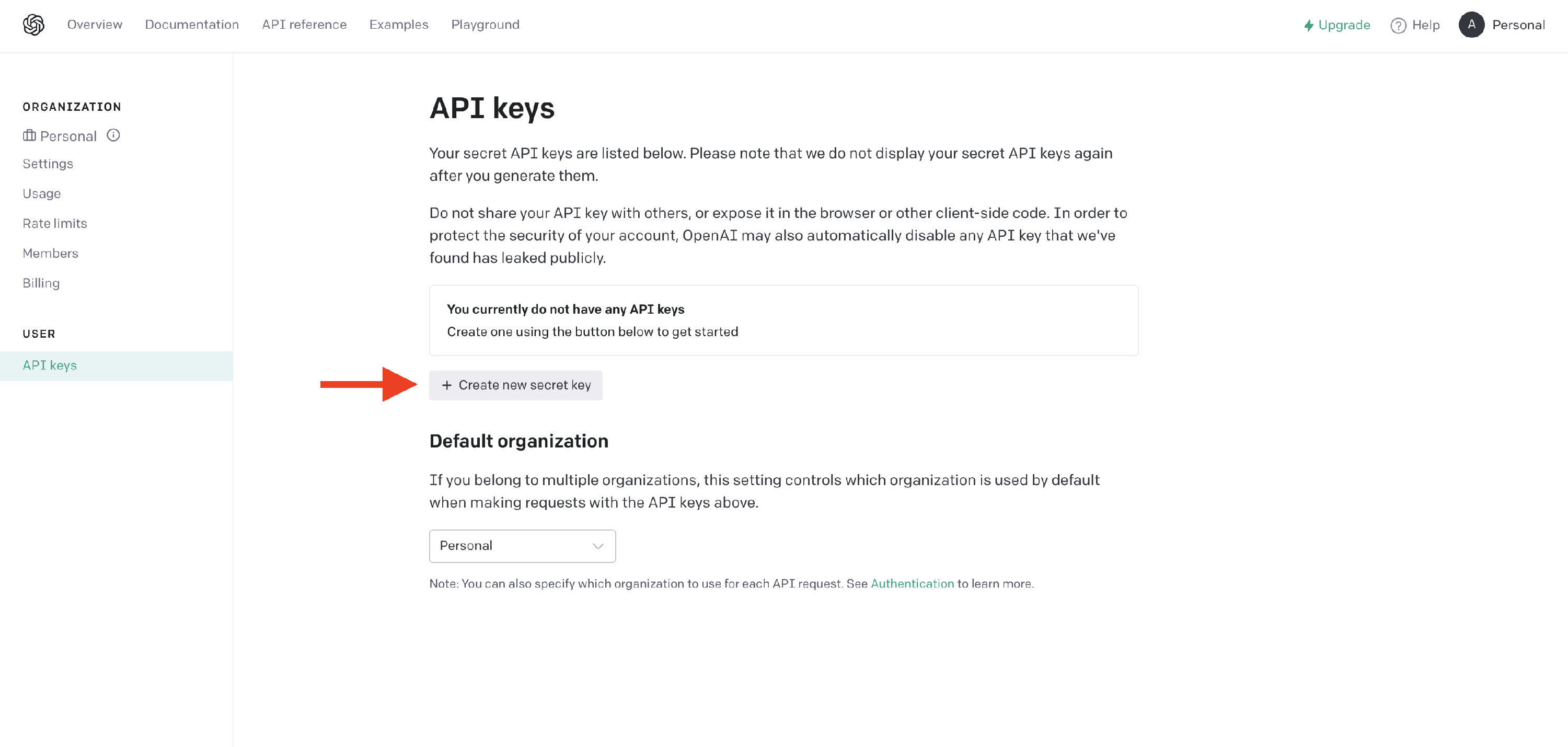 2 On the API keys page, click on Create new secret key.