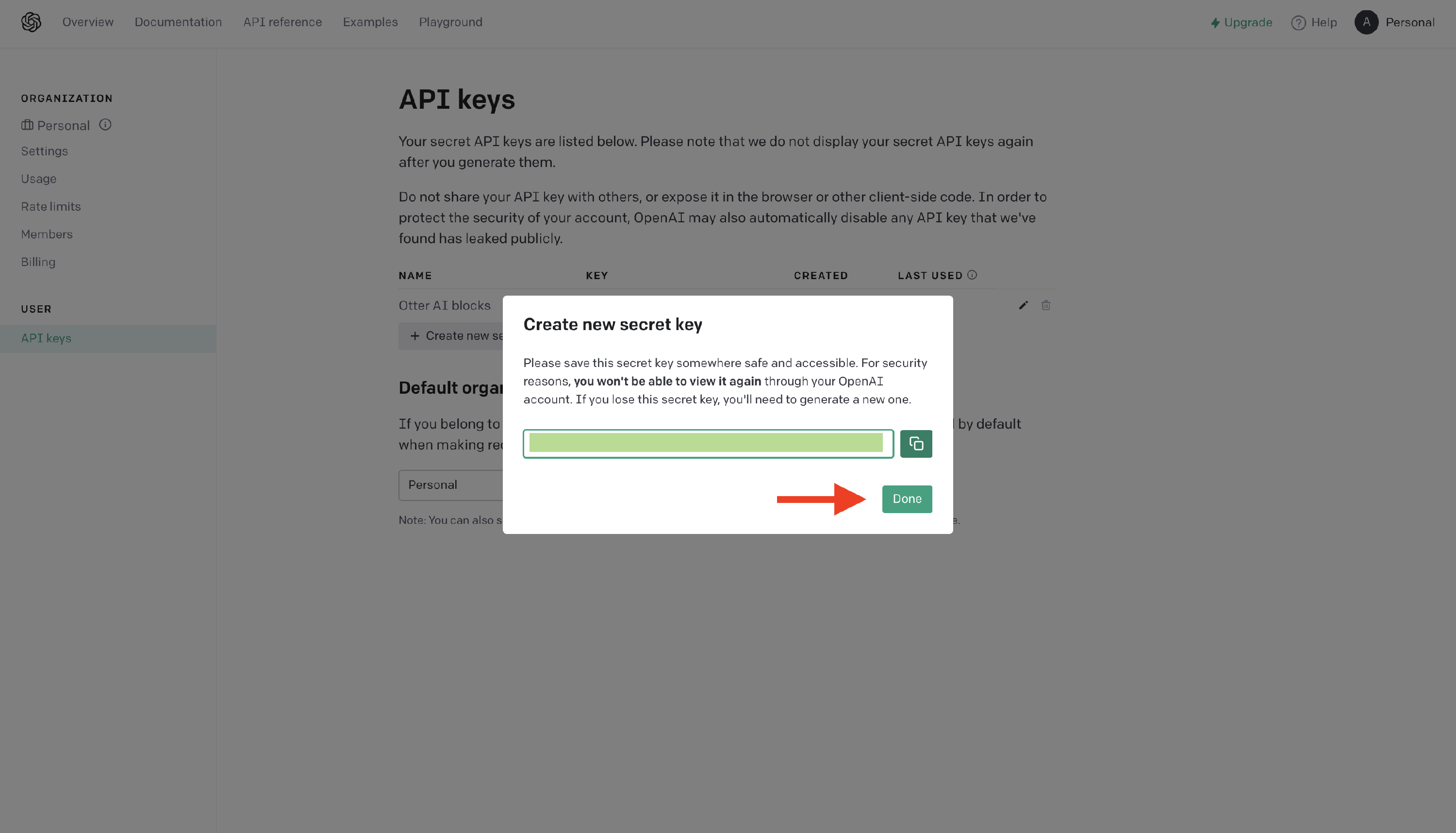 4 From the new modal, copy the API key and click on Done.