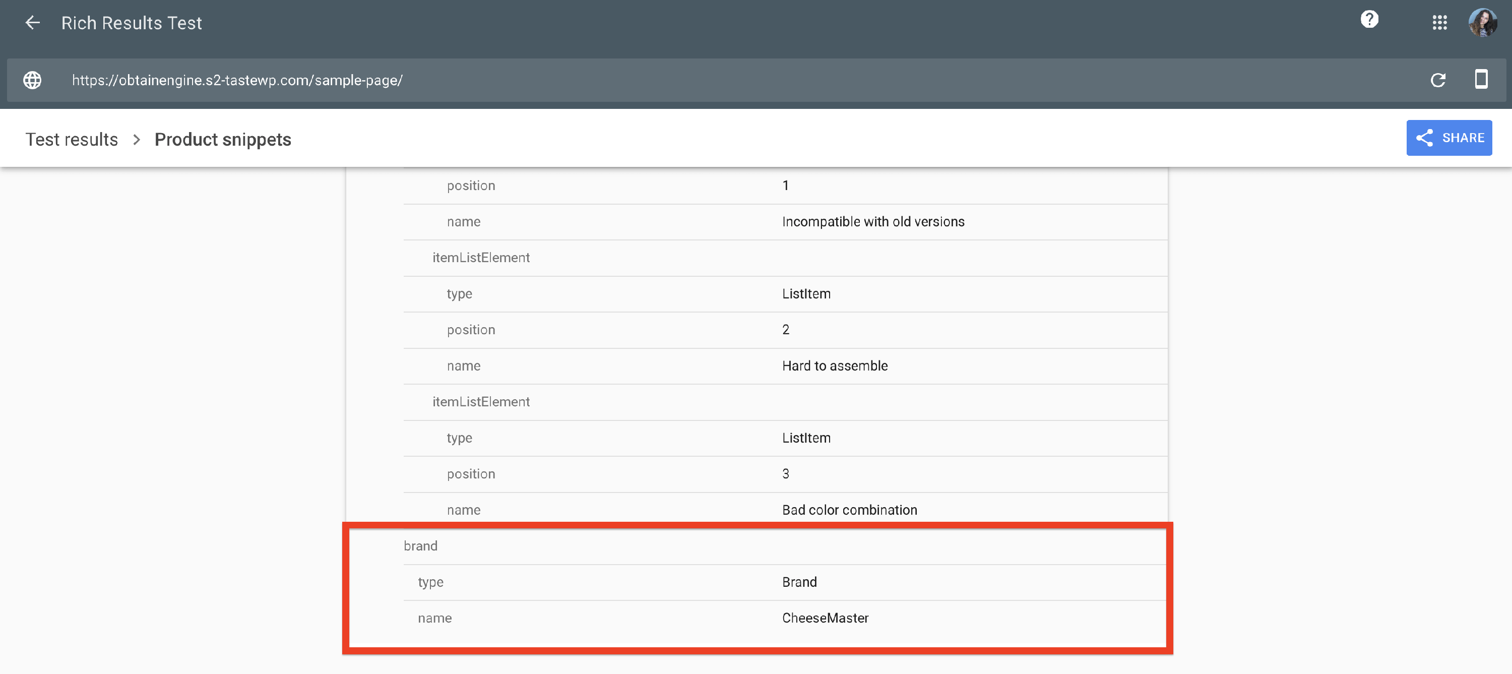 The Product Review block, by default, displays the product name, rating, pros, and cons, price, as well as some key characteristics. These appear in the structured data of the post where the block is inserted.
