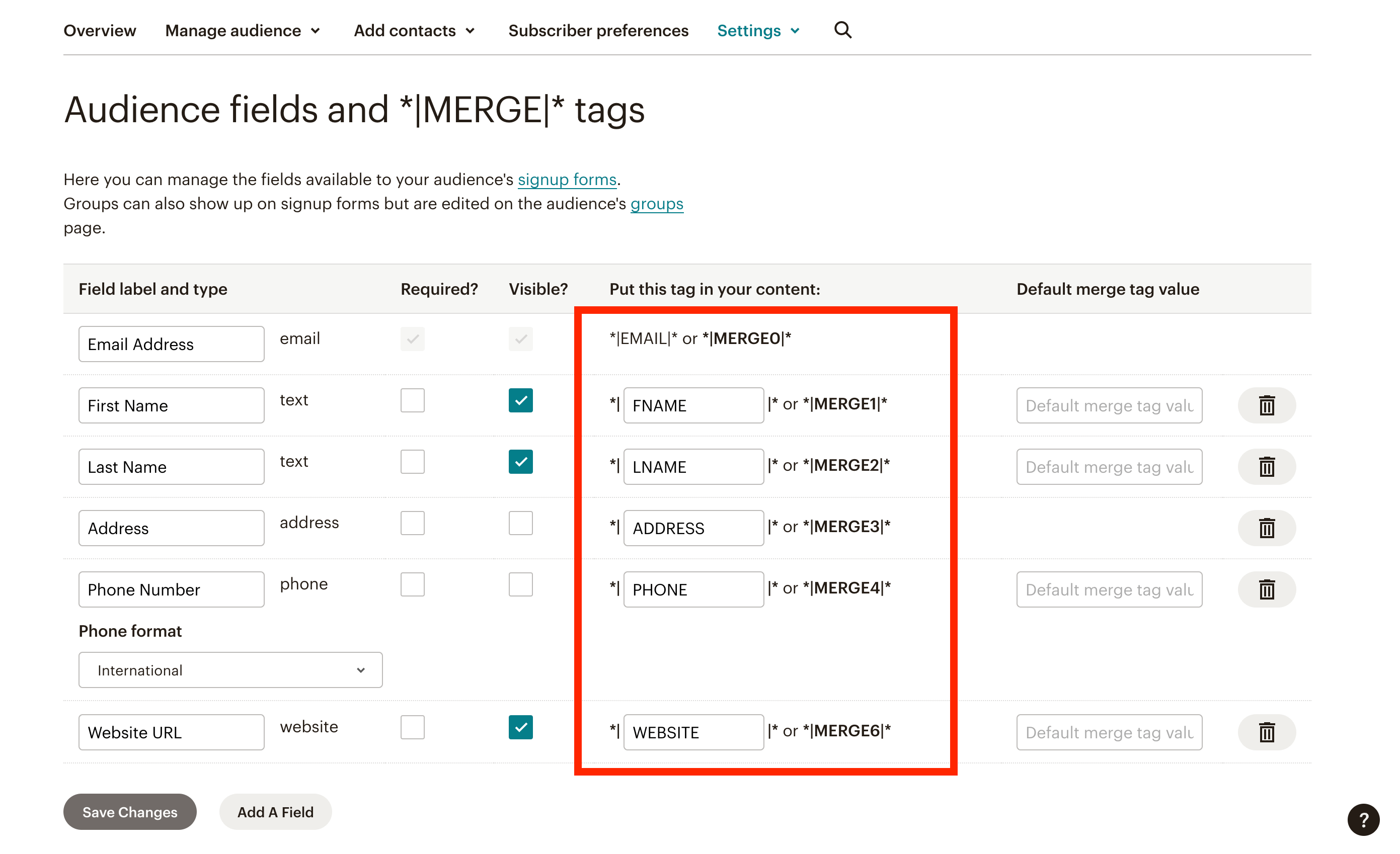 1 Navigate to your Mailchimp Dashboard > Audience > All Contacts > Settings > Audience fields and *|MERGE|* tags.