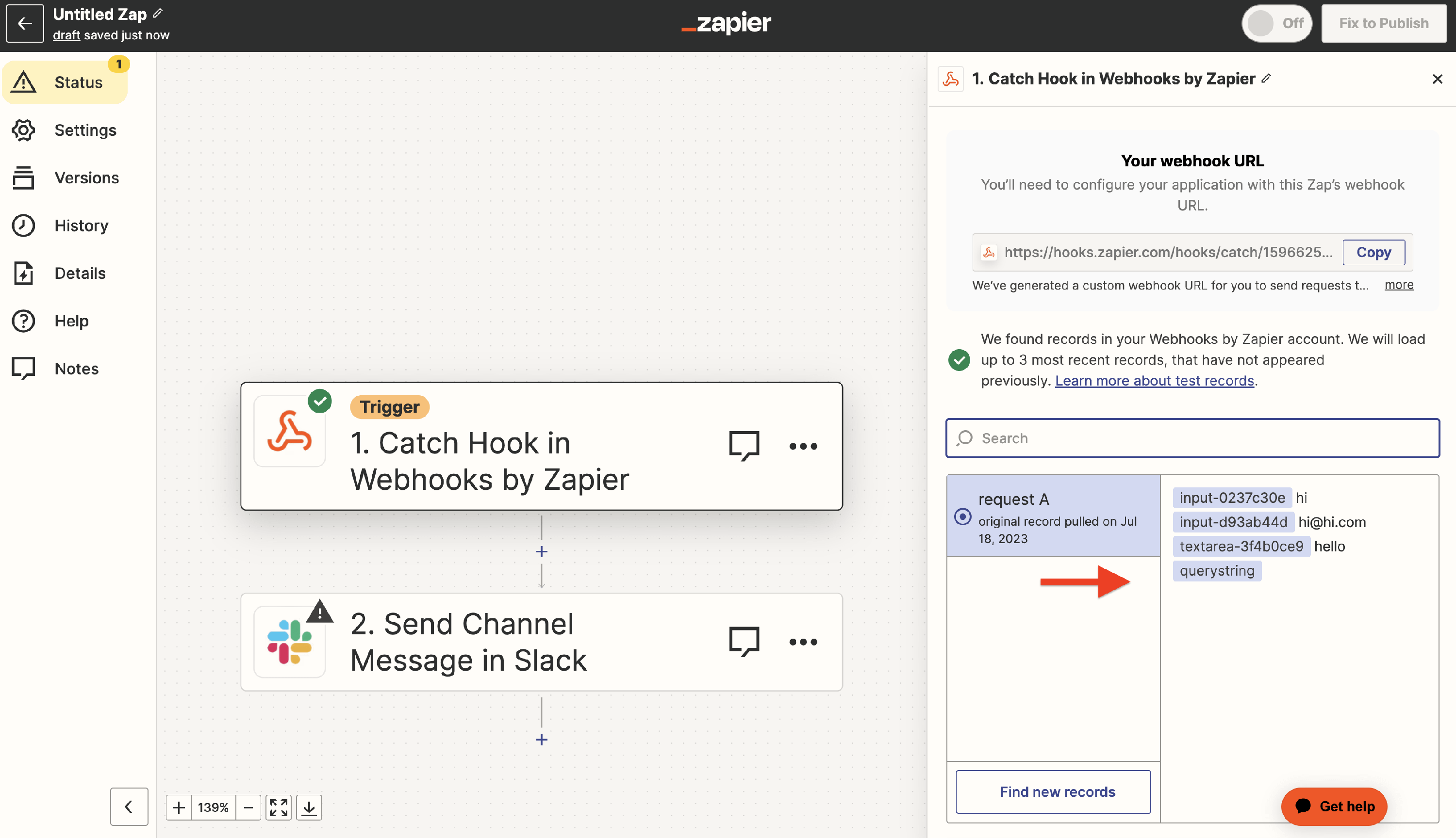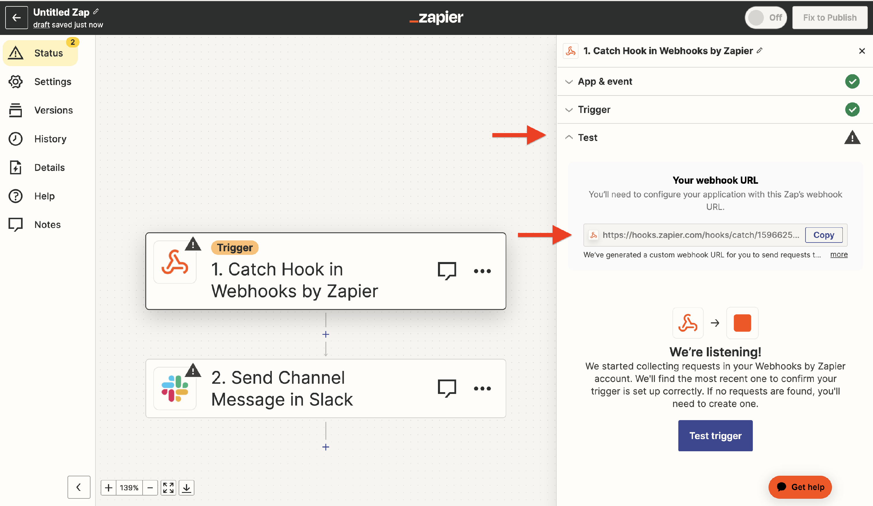 The last part is to test the connection. This can be done by submitting your answer to the form, then going back to the Zapier interface. From the accordion where you copied the URL, click on Test Trigger. Once a submission is made, you will do something similar: