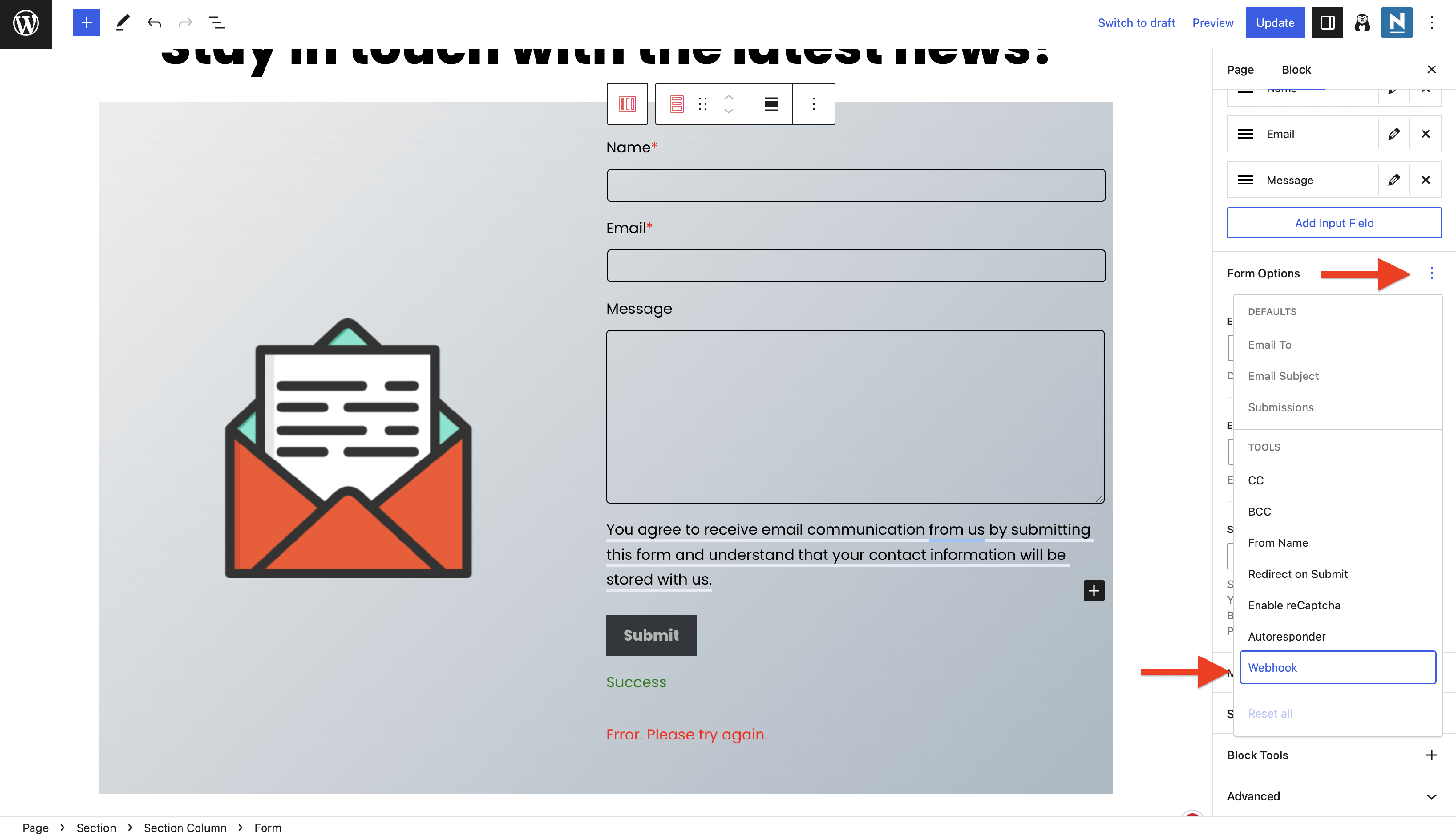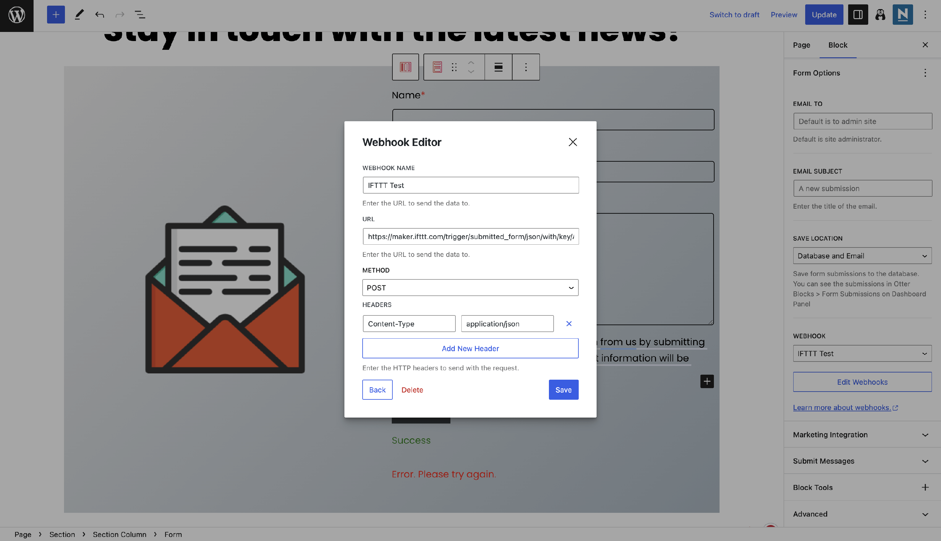 https://maker.ifttt.com/trigger/submitted_form/json/with/key/AjdeTuqvKTHtbInv4xa8u3(...)14 Copy the code and navigate to the website page where you added the Form block.