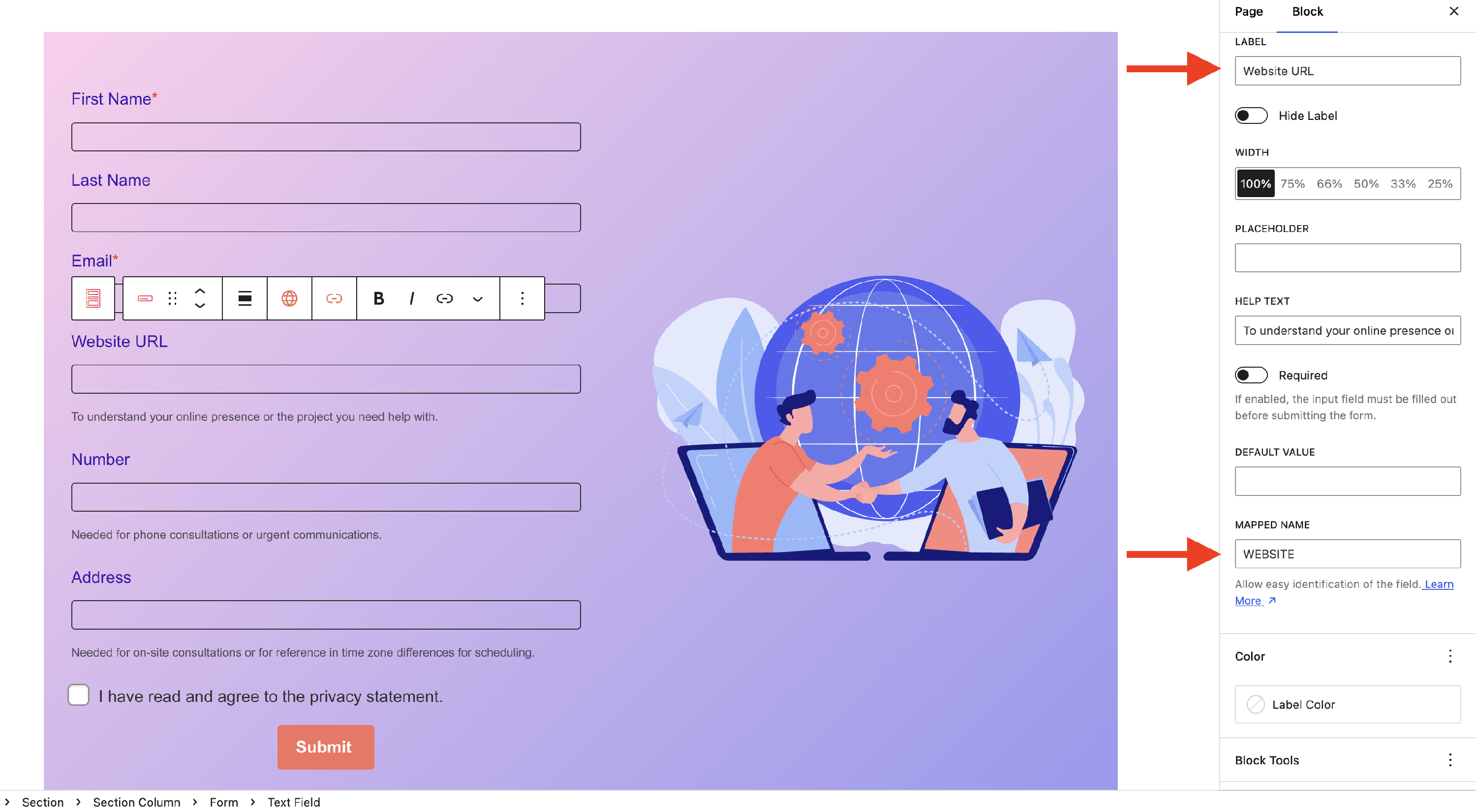 4 Click on each form item and add the corresponding Mapped Name, according to the Mailchimp Tags: First Name - Mapped Value = FNAME; Last Name - Mapped Value = LNAME; Website URL - Mapped Value = WEBSITE, etc.