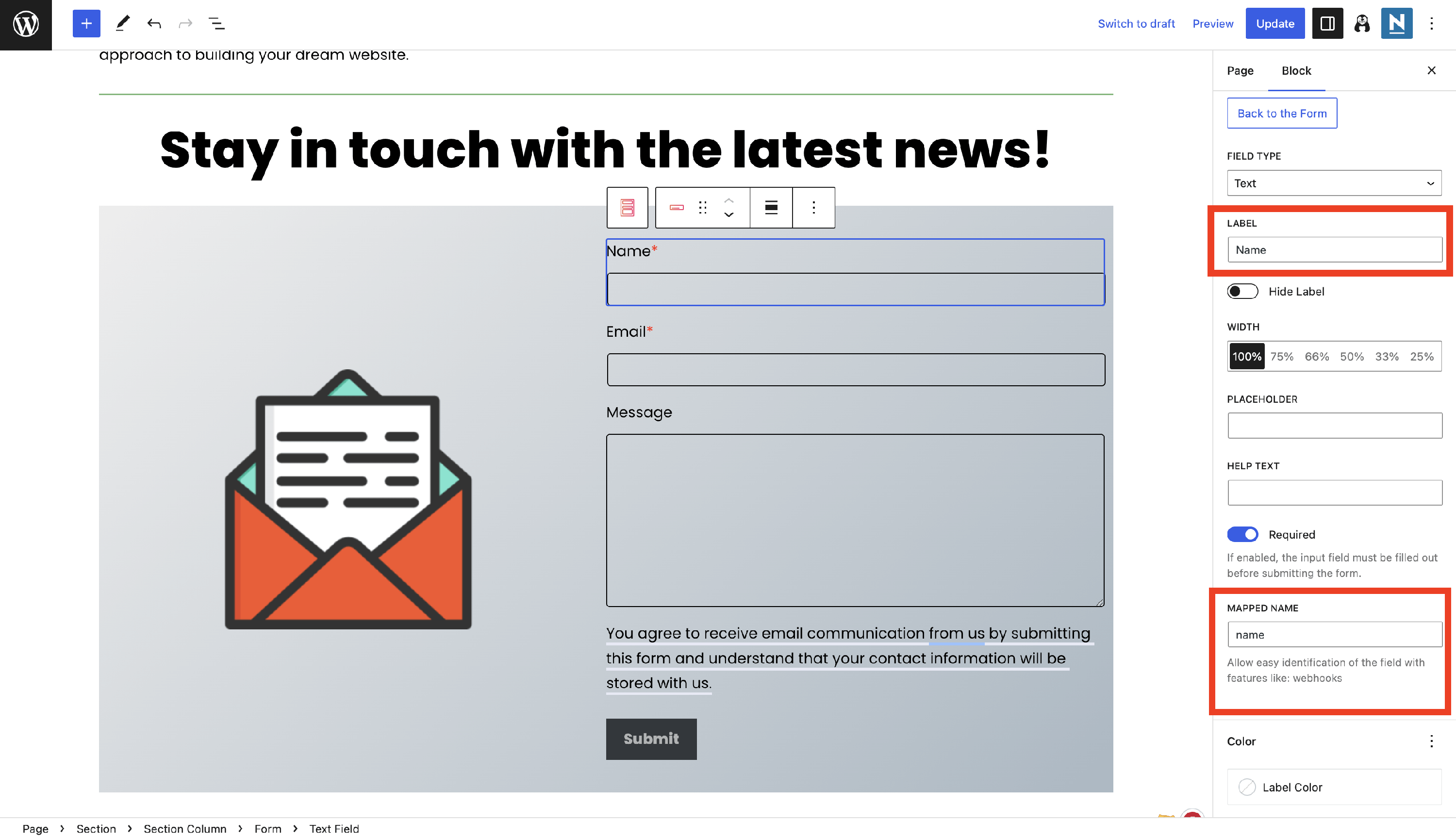 Additionally, the mapped name can be used to retrieve data from the form to your Mailchimp dashboard. Using Otter Blocks' integration, the fields set in Mailchimp can be filled in with form values, as described below.