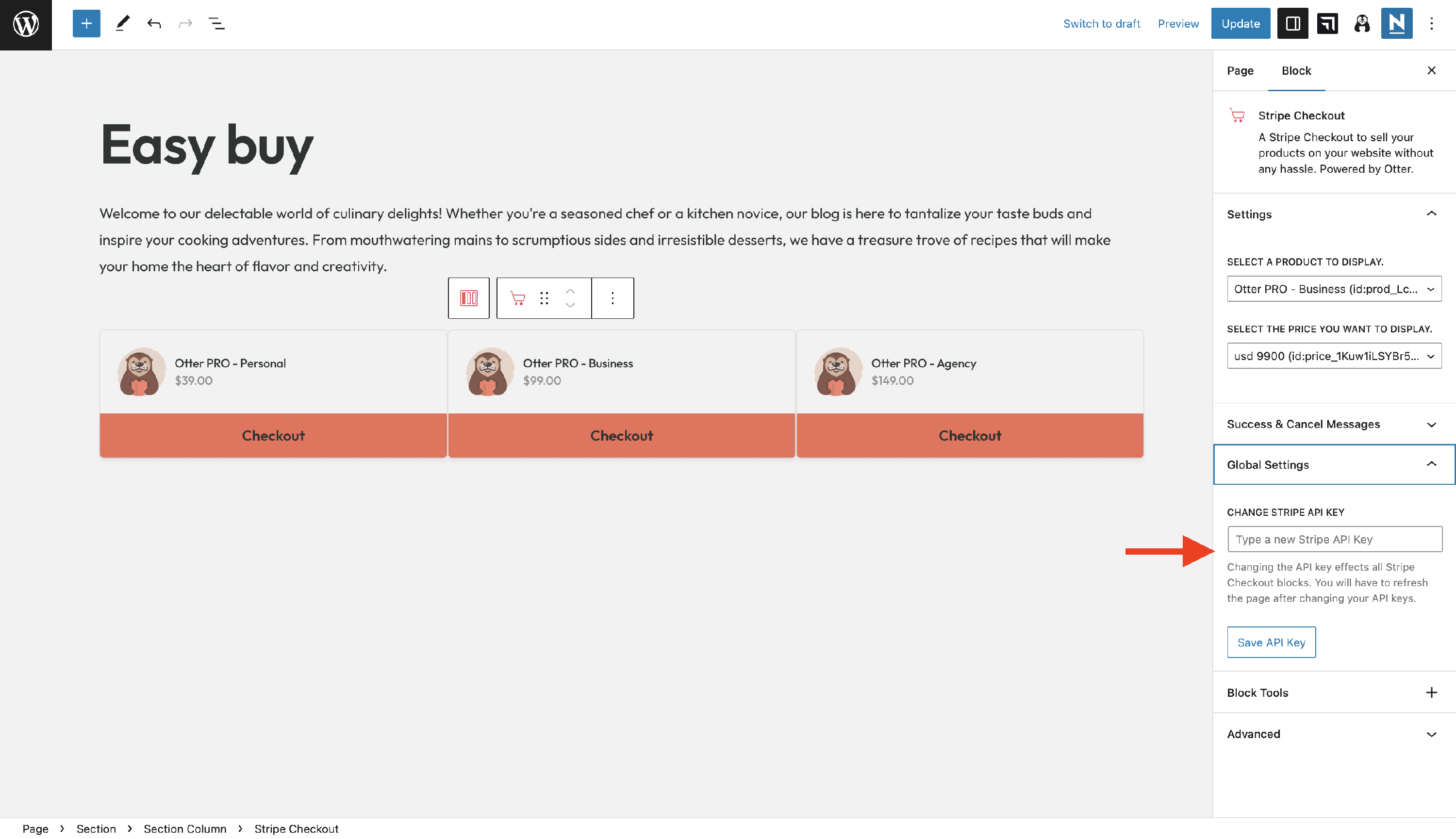 Alternatively, the Stripe API key can be changed locally, inside the editor, under the Global Settings accordion: