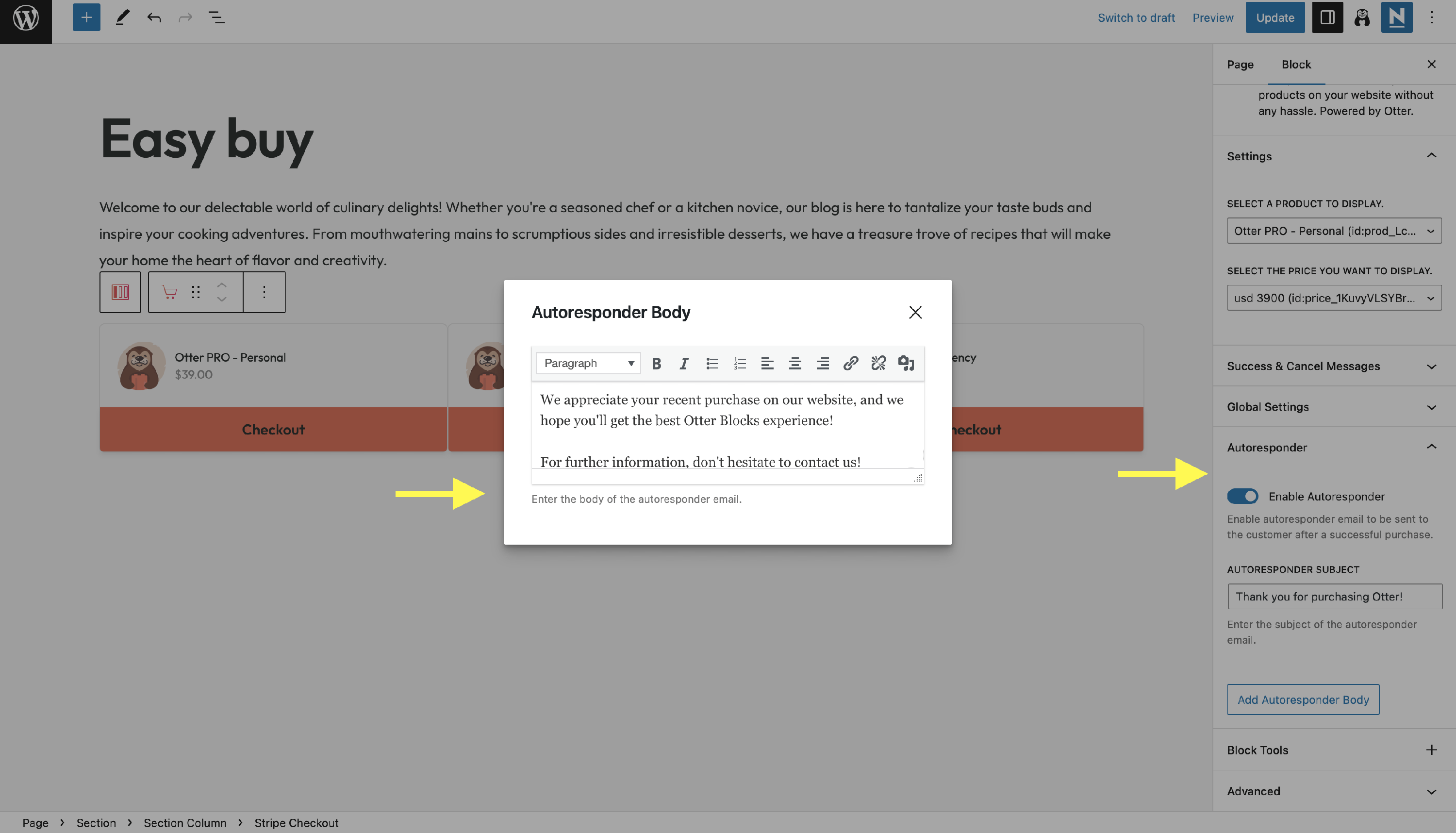 - enable Autoresponder, which will allow you to automatically send messages to customers after successfully making a purchase. Inside the Autoresponder accordion, you can customize the email subject to let the customer know what the mail is about, then add a personal body text: