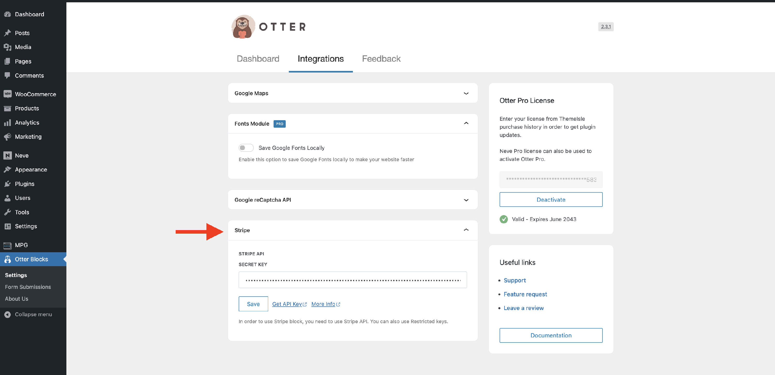 To use the Stripe Checkout block, first, you have to insert the credentials. For this, navigate to the Otter panel, then switch to Settings > Integrations in the Stripe accordion: