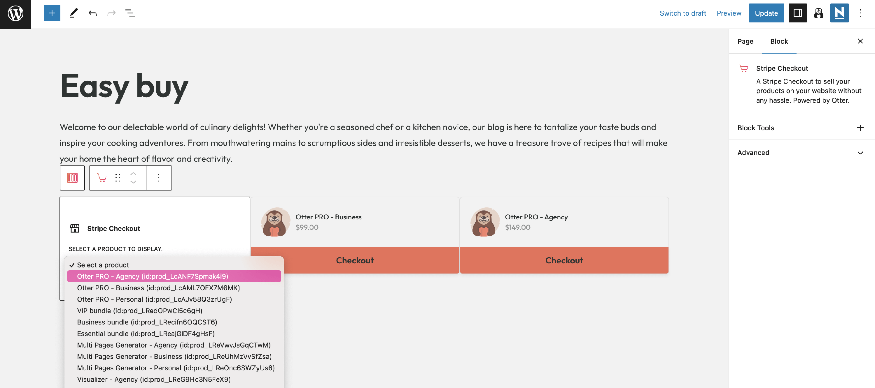After that, navigate to the desired page and add the Stripe Checkout block. Then, select the product that you want to sell and the price for it (in our example, the price is available in euros or dolars).