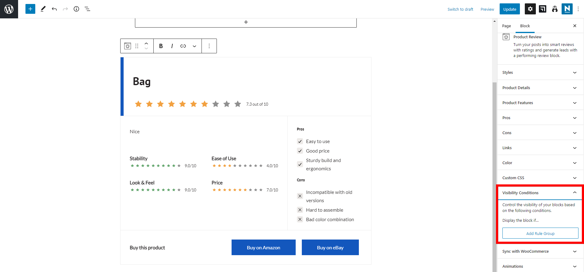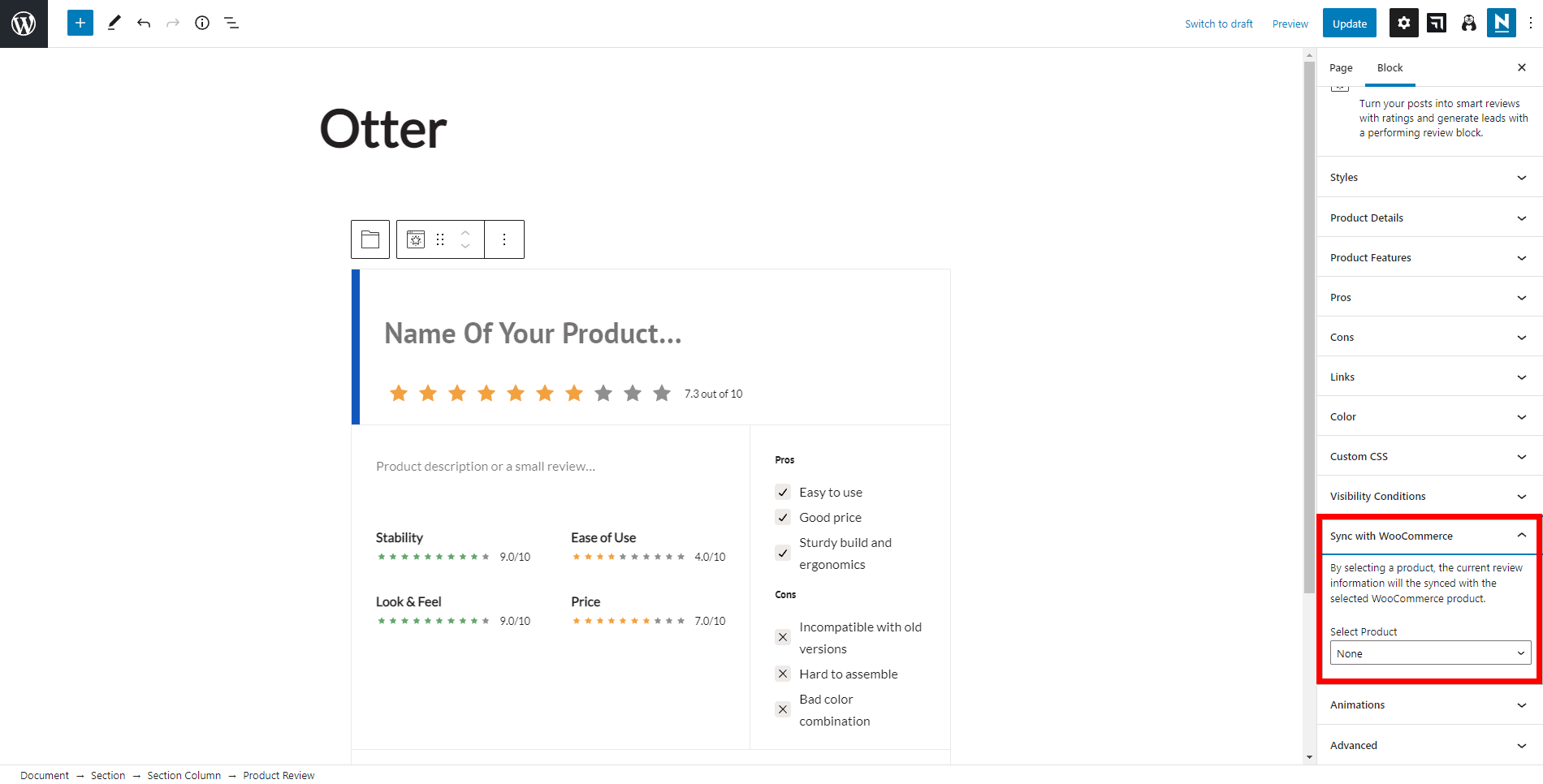 This feature is related to the Product Review Block. It displays the review of a manually added product, but this process can be automated by using the details of a WooCommerce product.