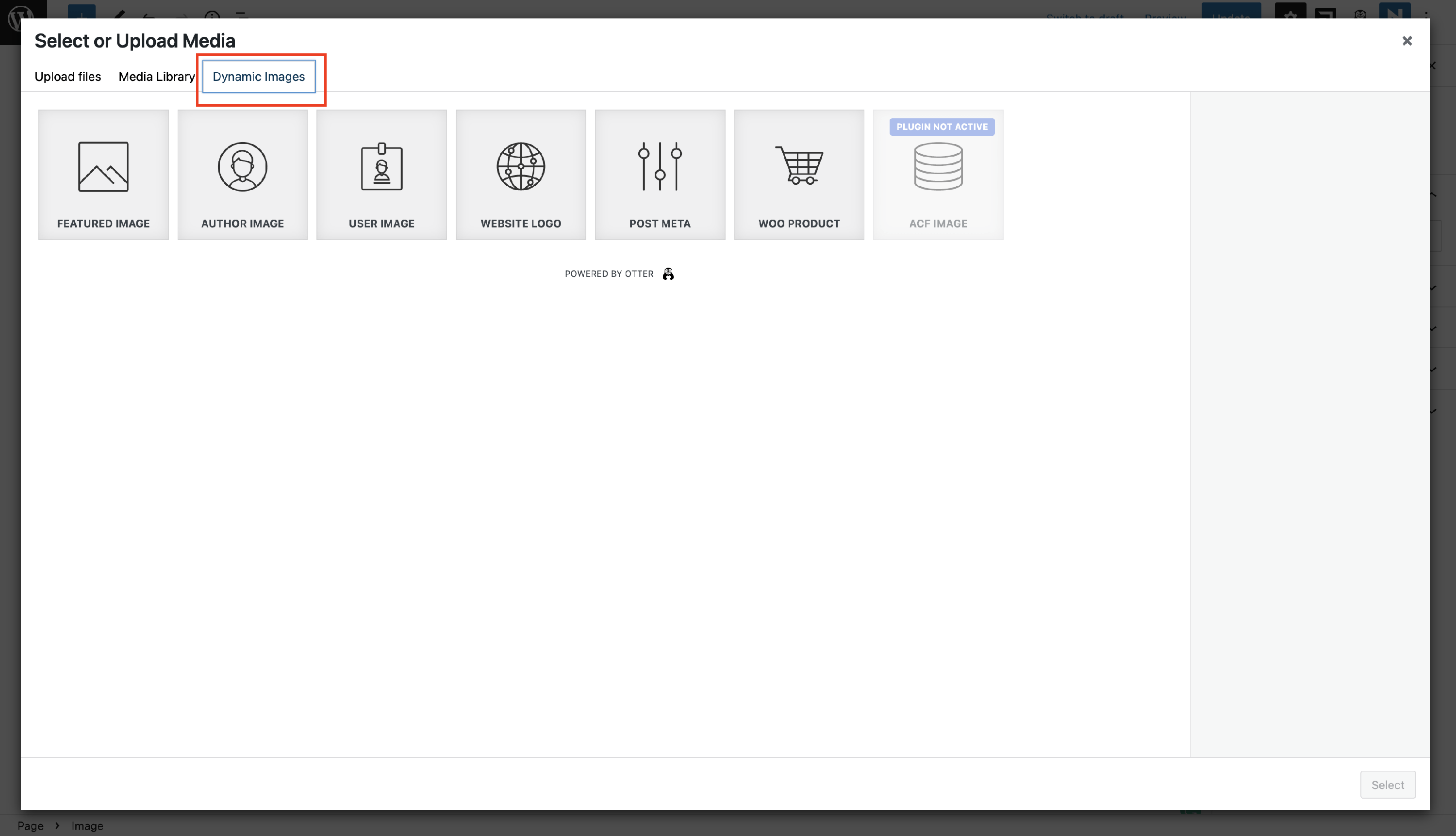 The Otter plugin allows you to add dynamic images, which will import information depending on the elements you pick from the menu in the editor after adding the Image block and clicking on the Upload / Media Library button. It creates a third tab called Dynamic Images, from which you can start adding the desired elements: