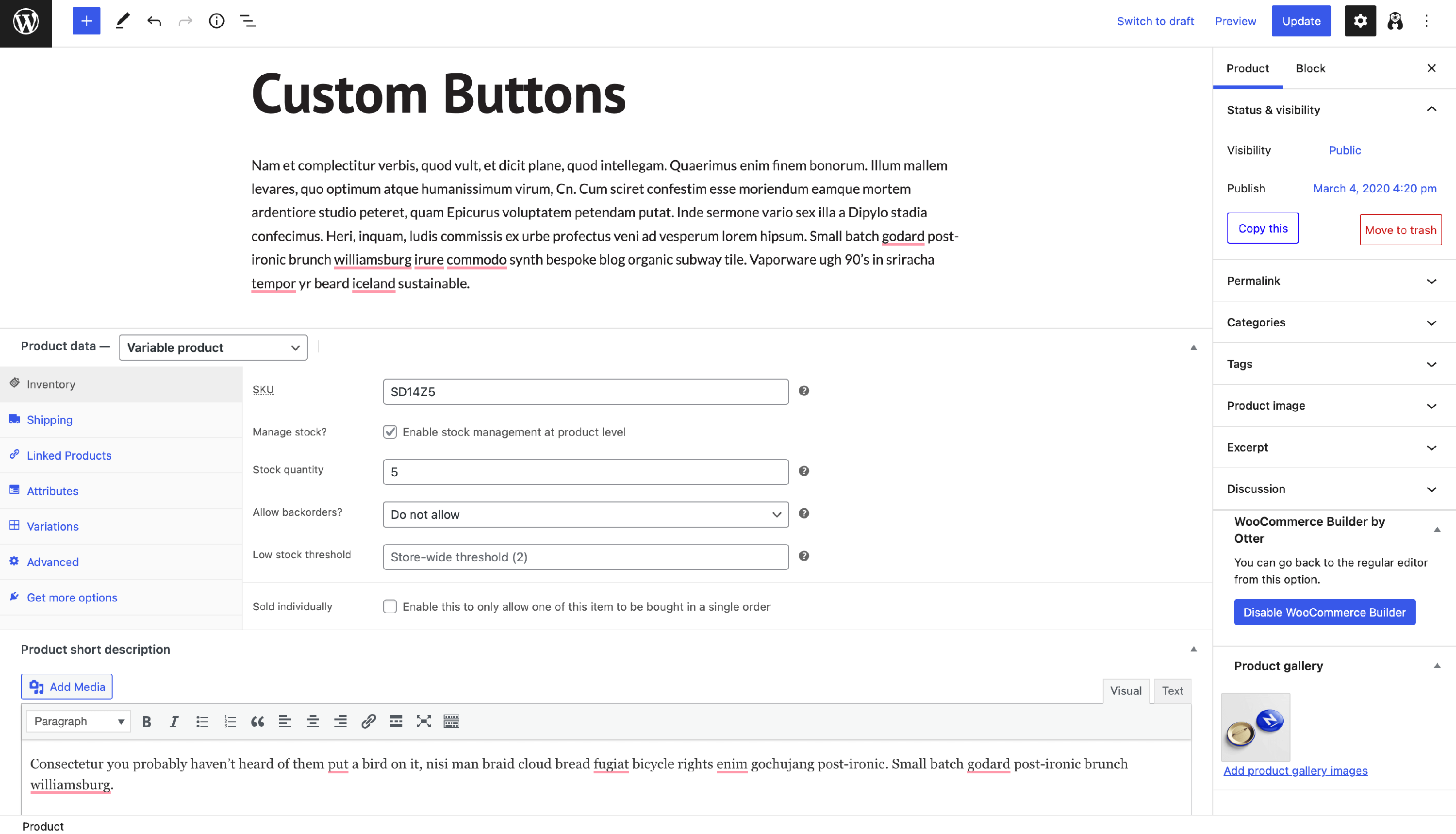 The WooCommerce Builder is a powerful tool that allows you to create a product page as you wish, using the blocks and the resources available on the edit product page.