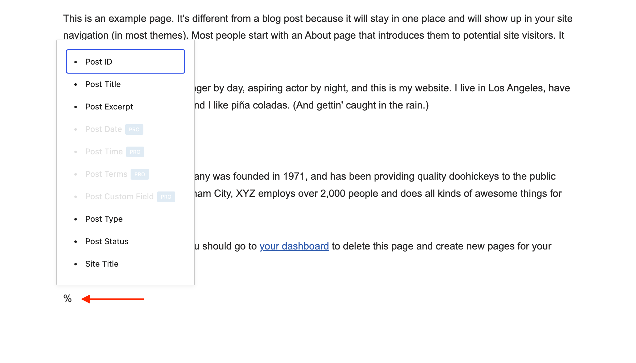 The Dynamic Values feature is a time saver option that ensures the syncing aspect of your website, allowing you to use a dynamic value that inherits the specific information of a certain post / page. This can be done by accessing the editor and inserting the "%" symbol. It will open the dynamic values list from which you can choose.