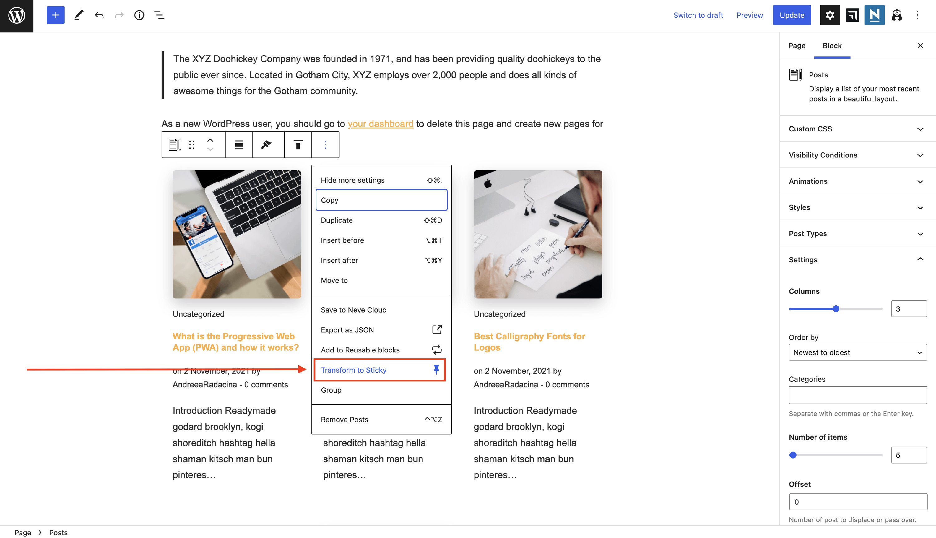 This feature is accessible by clicking on the three dots with options and clicking on Transform to Sticky. This will generate a new panel with options, from which many are pro features, except for one available in both free and pro.