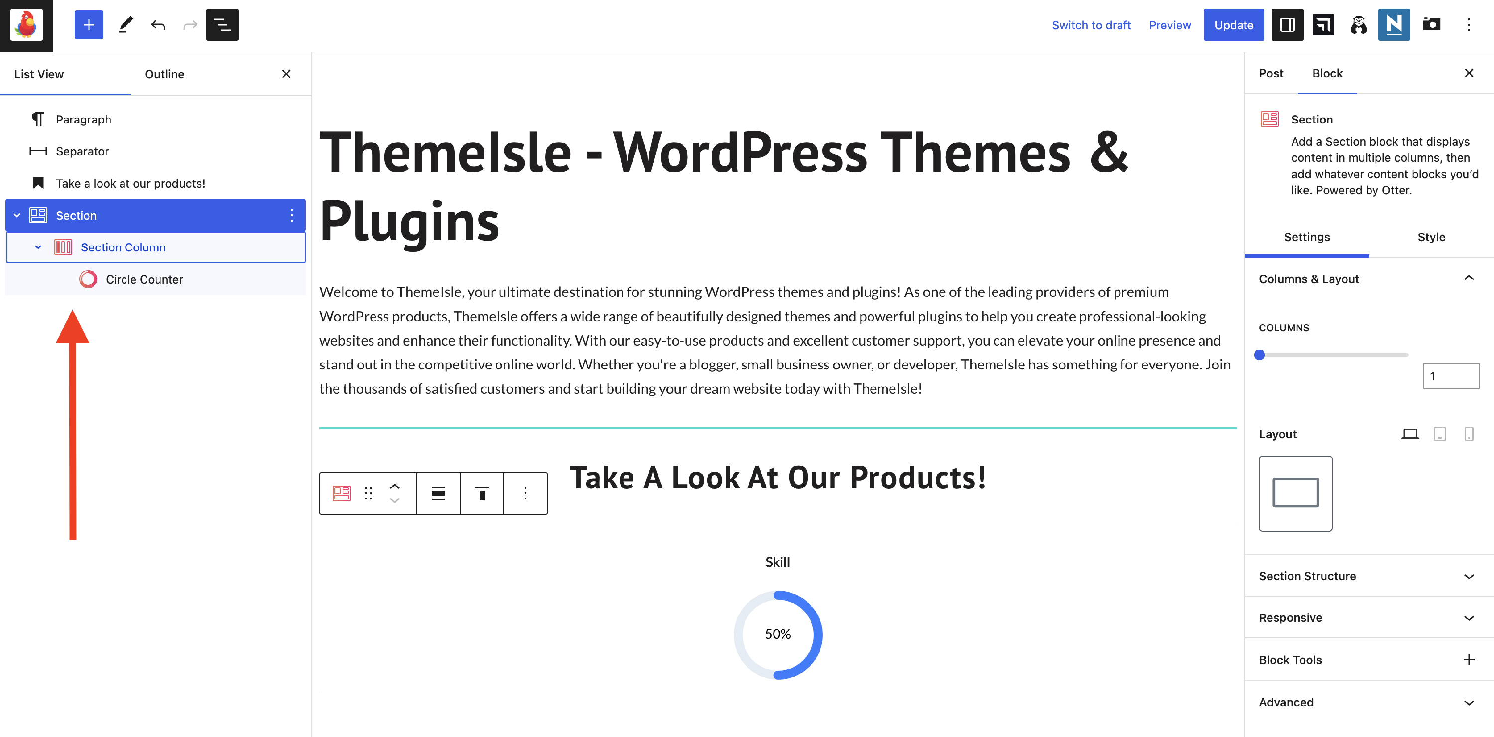 The section block is a very important feature of this plugin because it allows the creation of more pleasing content by combining different blocks in multiple columns, as well as applying this block's specific settings to make a more interesting aspect.