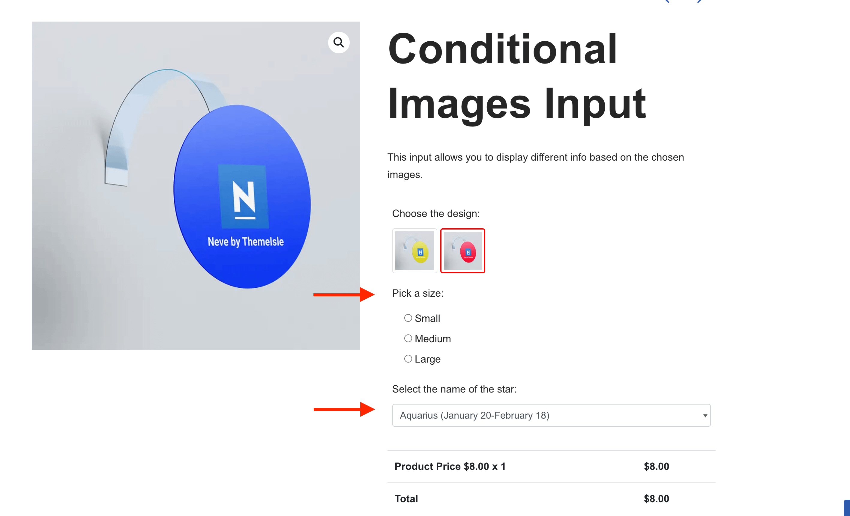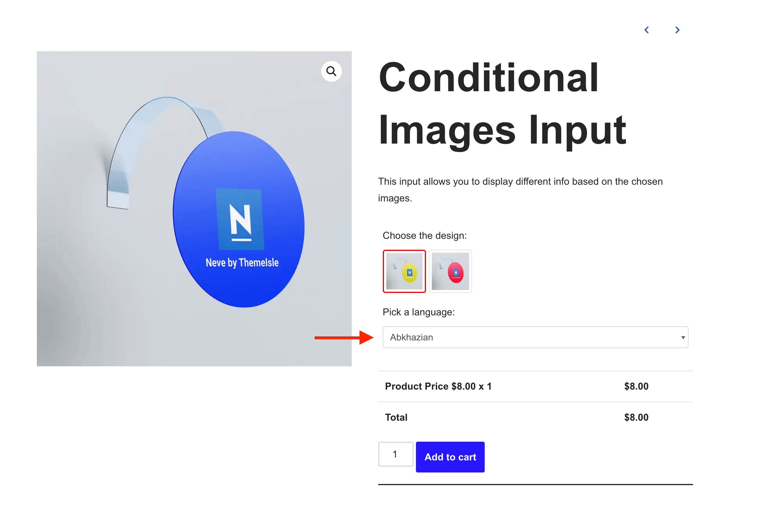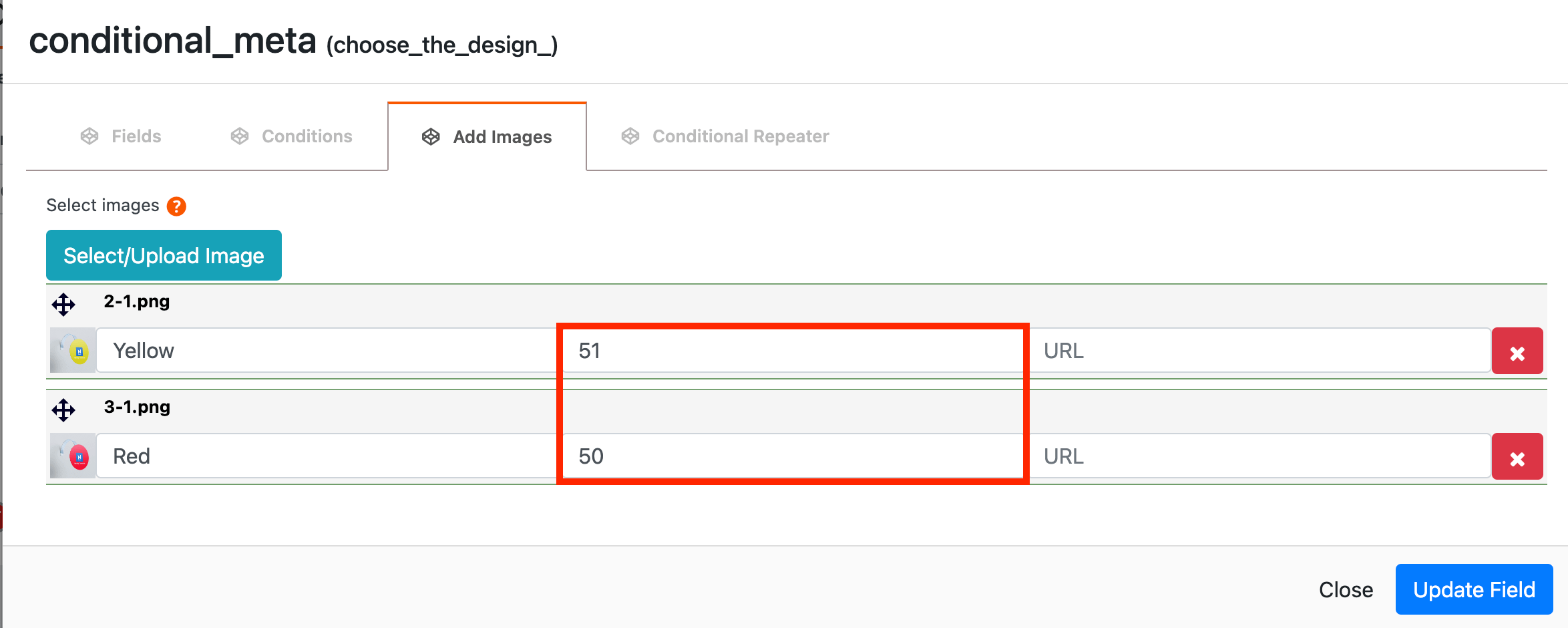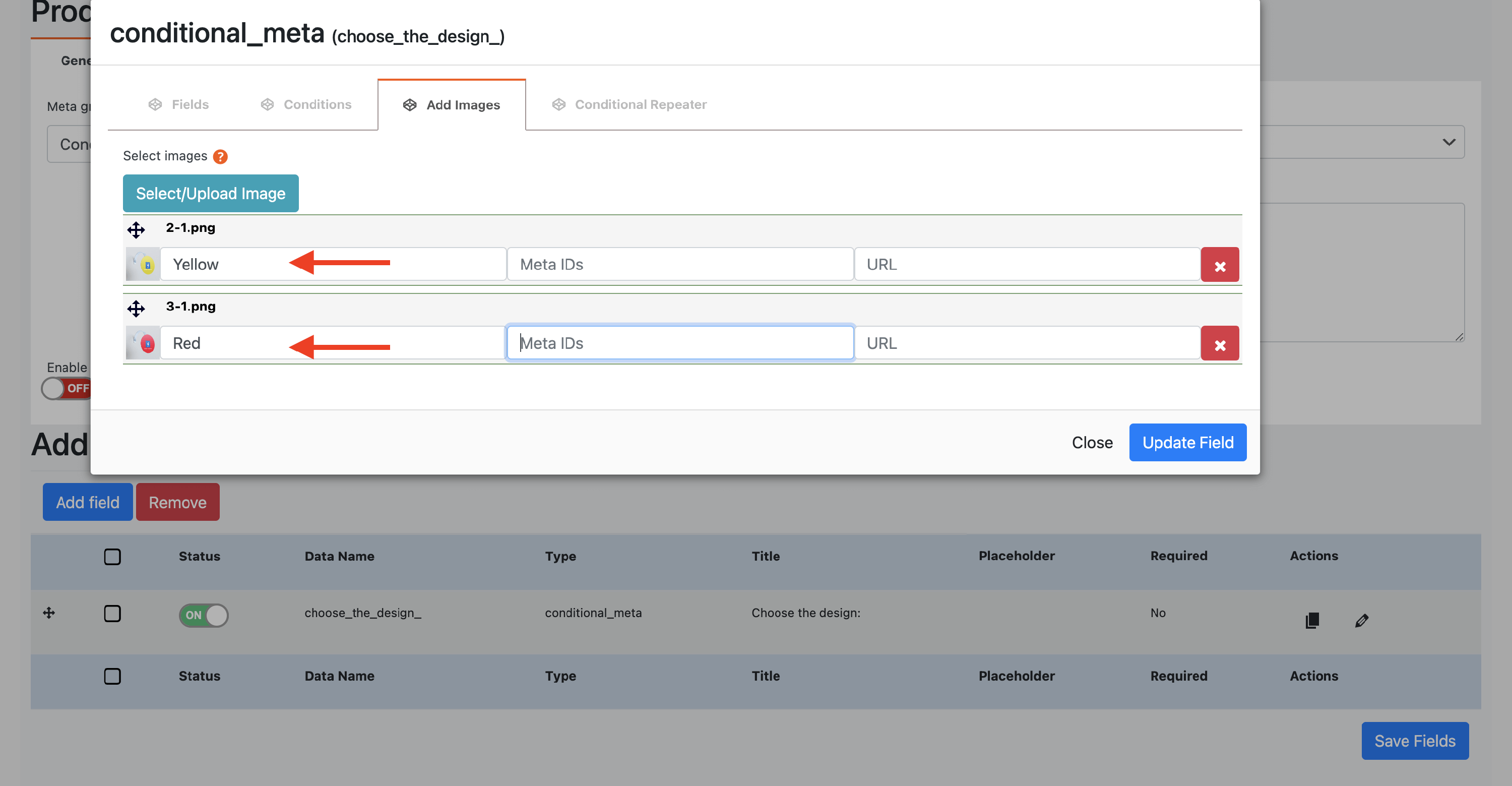 The Conditional Images input allows you to display different meta fields according to the chosen option. This way, the user can insert particular customizations for each variantion.