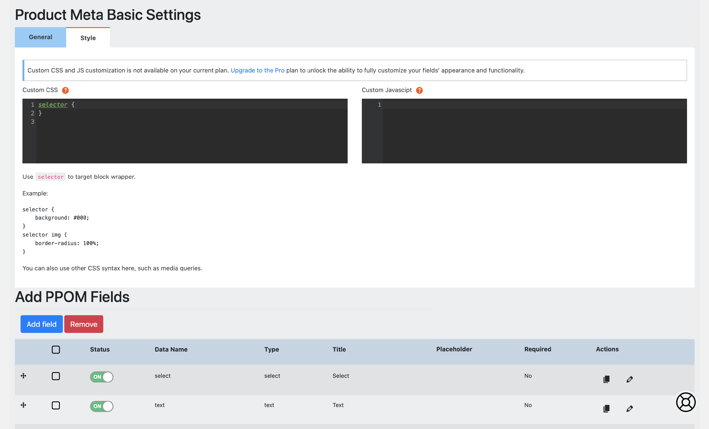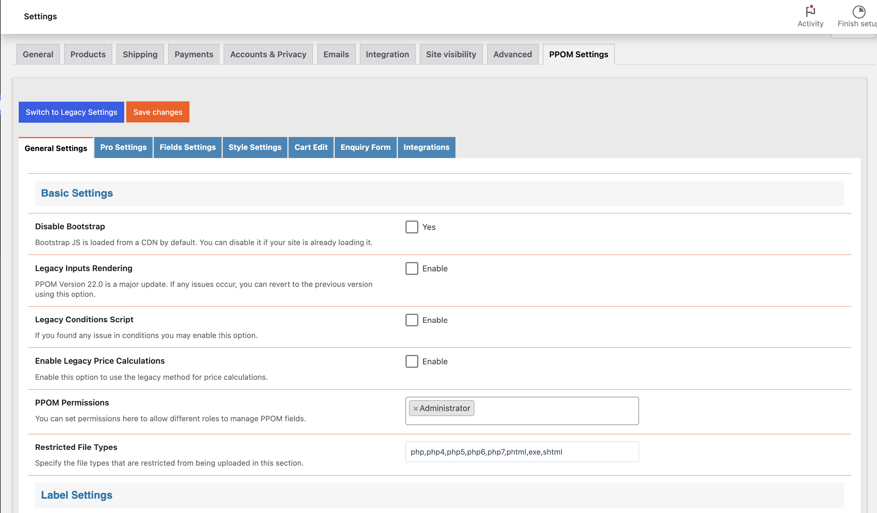 In the free version, you'll have access to the General Settings tab, where you can disable Bootstrap, adjust legacy settings, set permissions for managing PPOM fields, restrict certain file types from upload, and modify label settings for the pricing table.