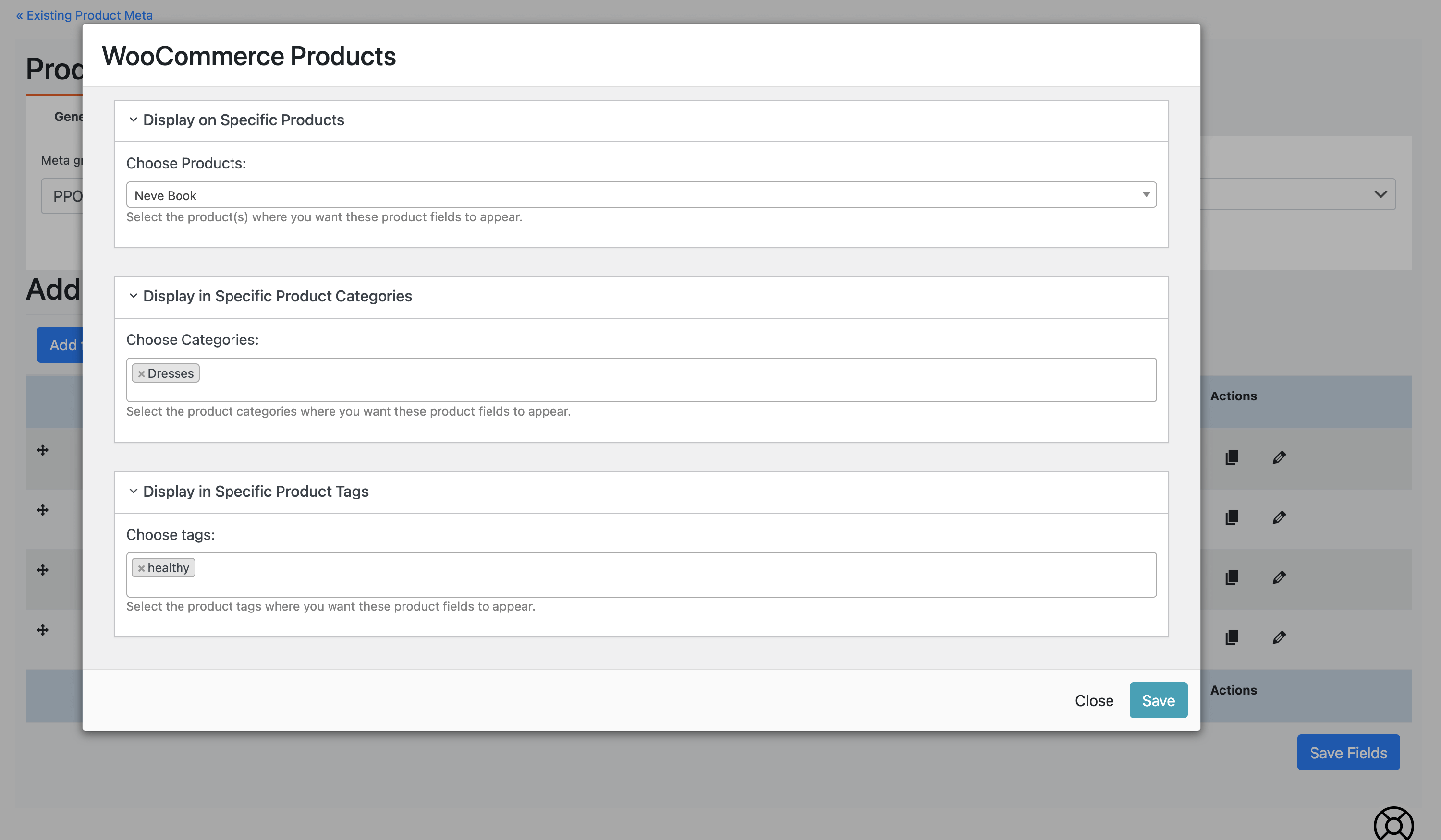 Then, the modal for attaching the meta group to one product, one or more categories and tags will appear. Make sure you save the changes.