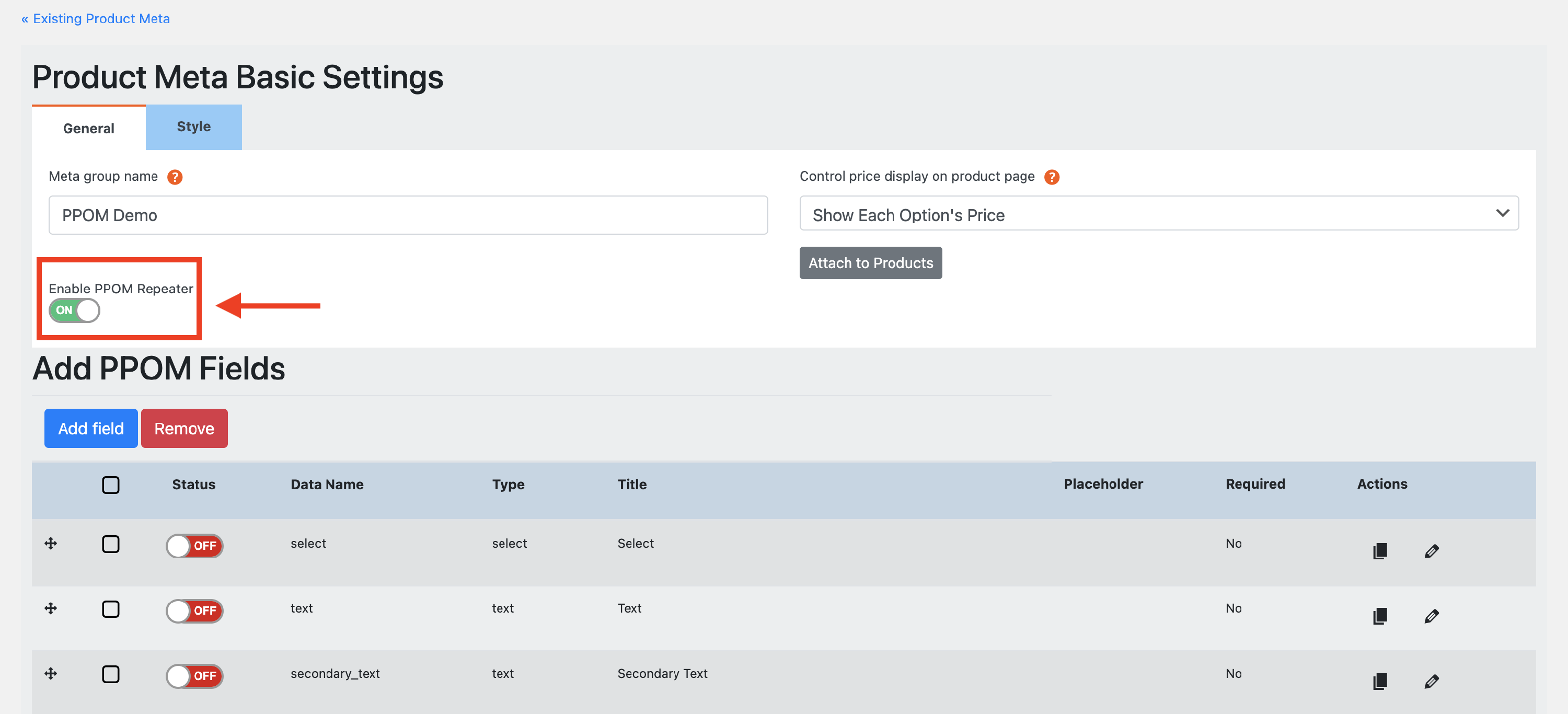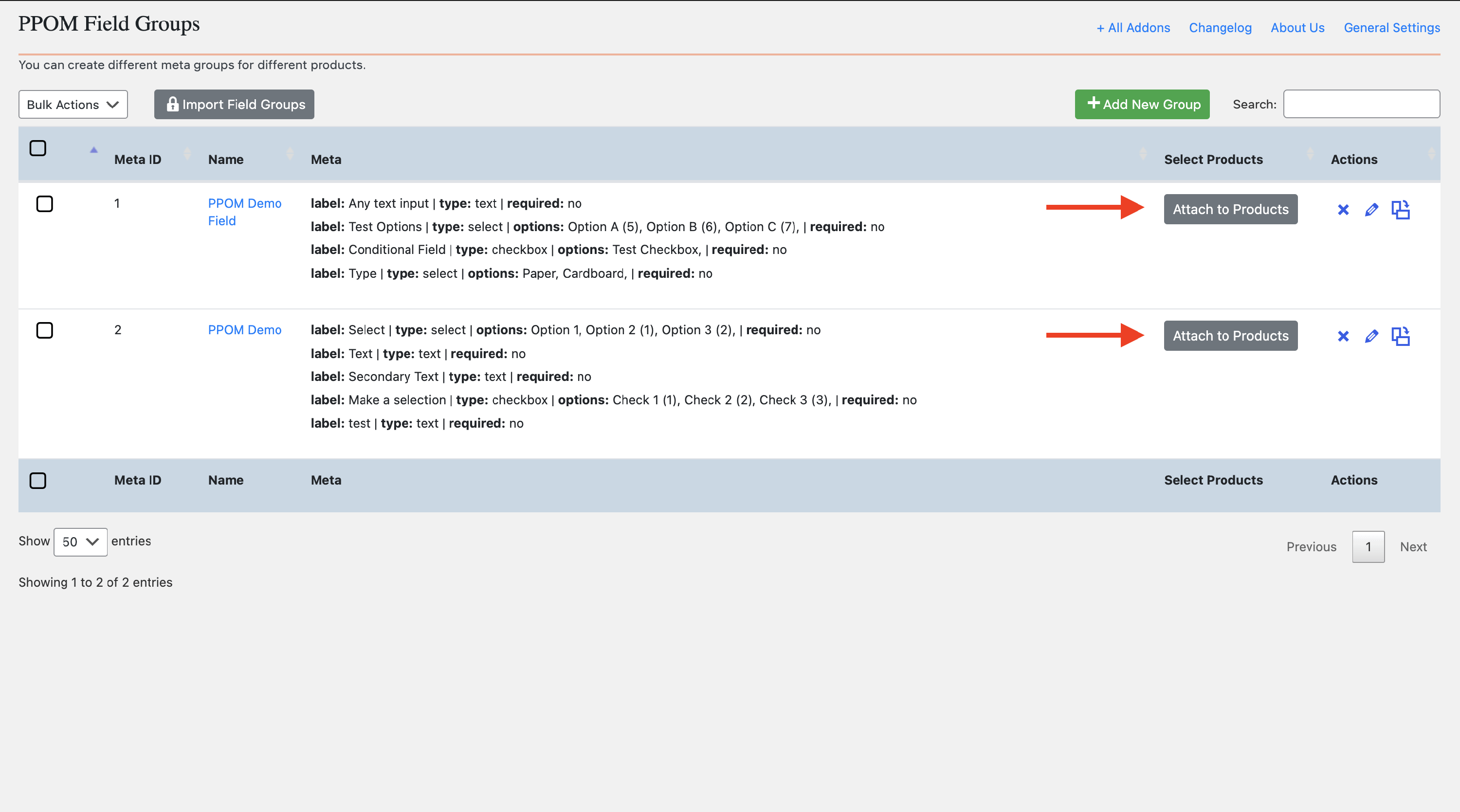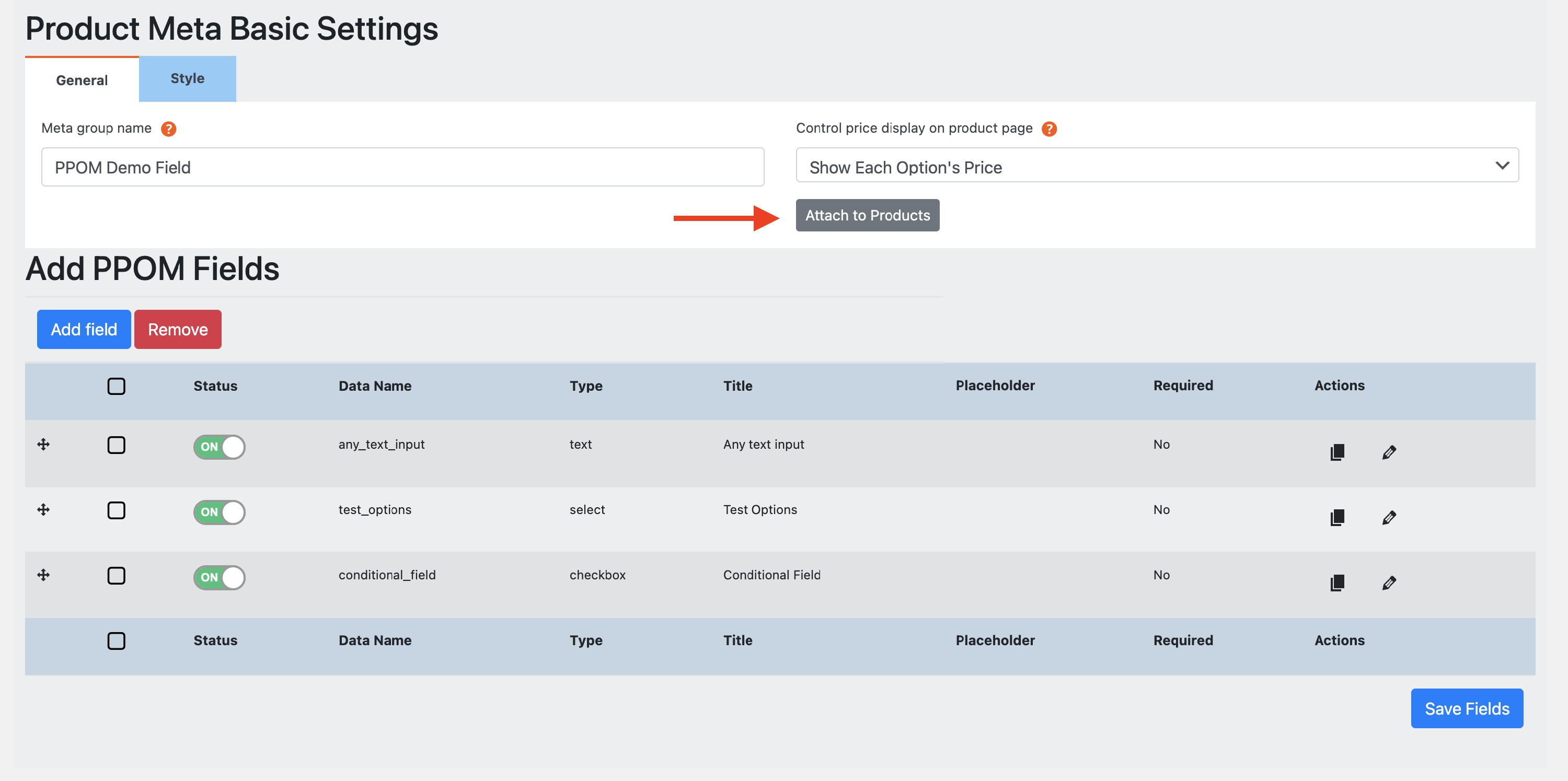 Once you have created fields, you can start attaching them to the products by clicking on the Attach to Products button, which becomes available only after saving the fields. This can be done for a meta group, not for the fields, so all fields available in a meta group will be attached to a product.