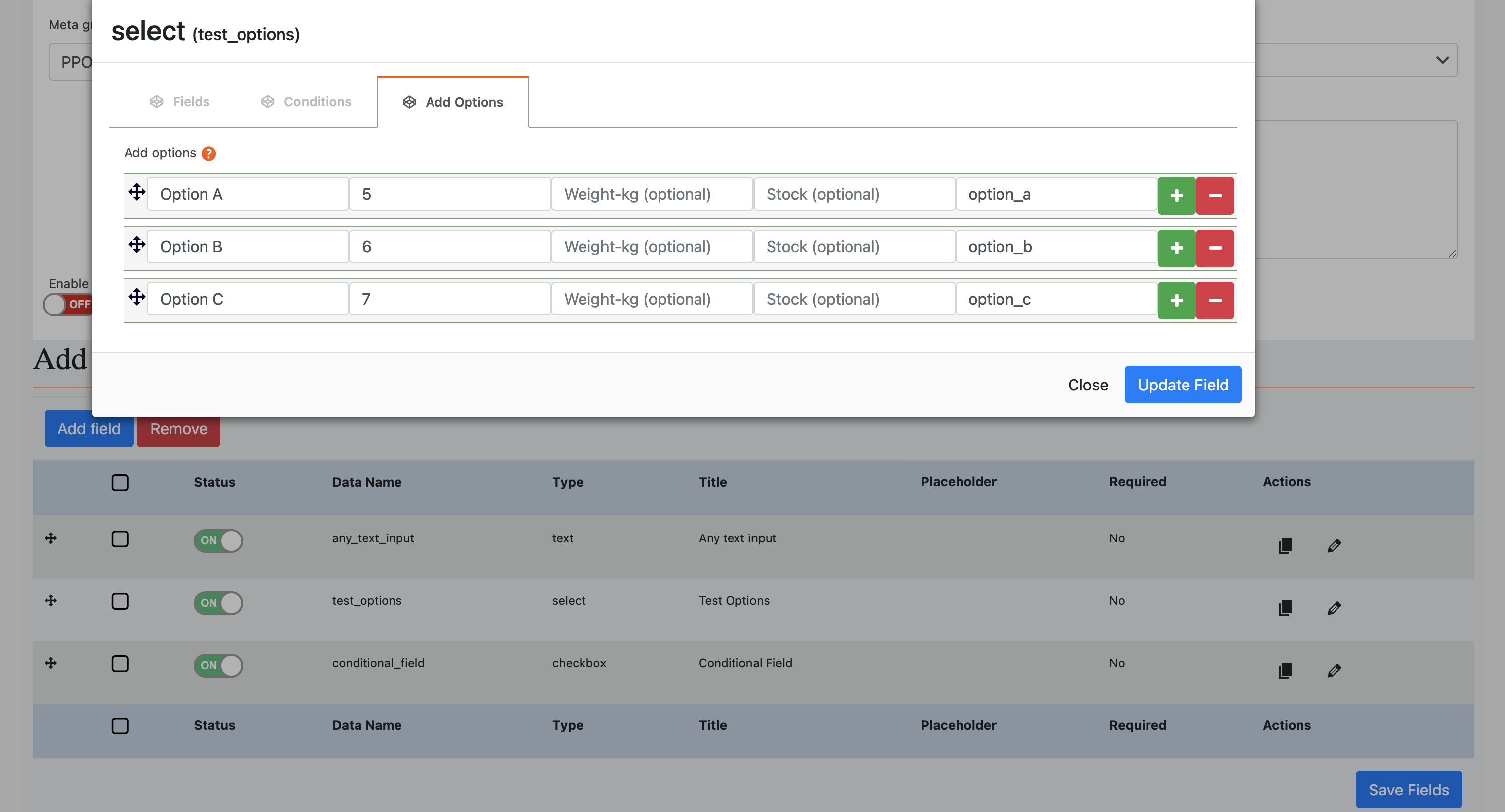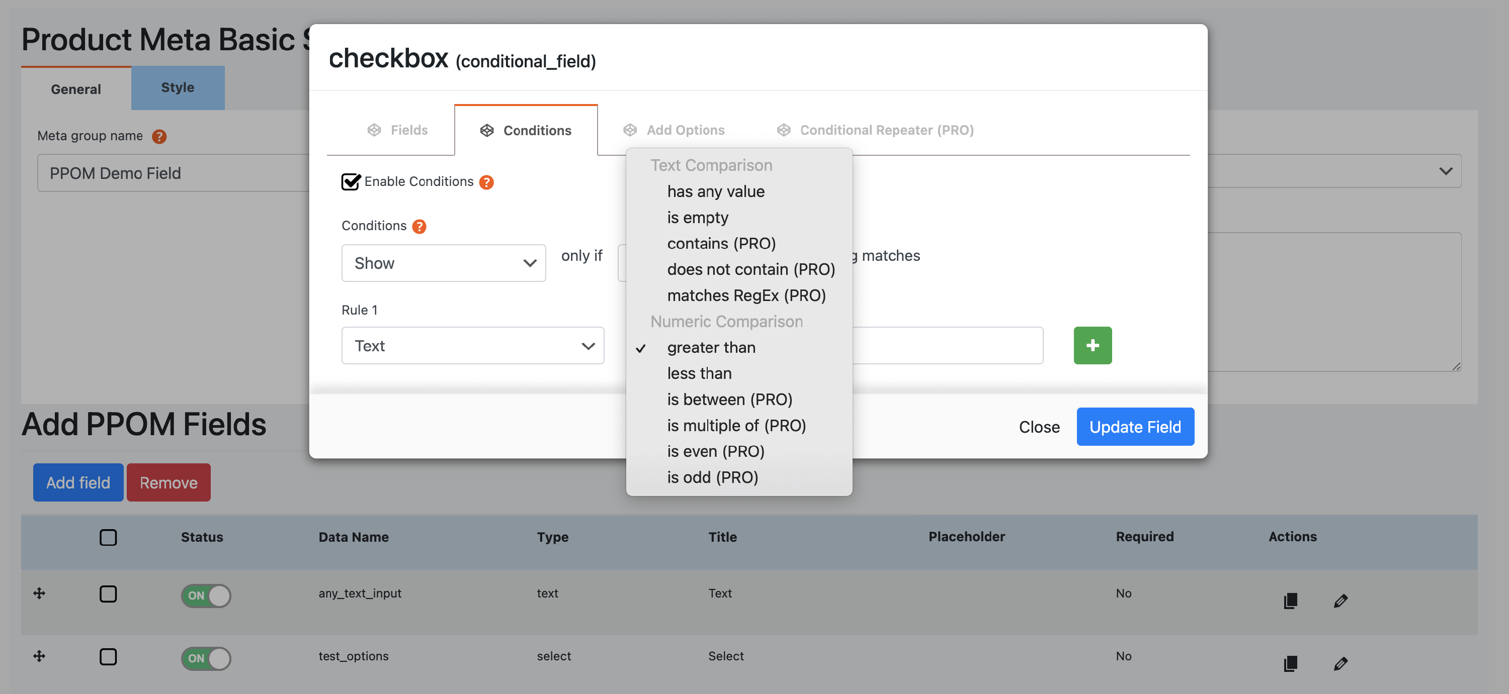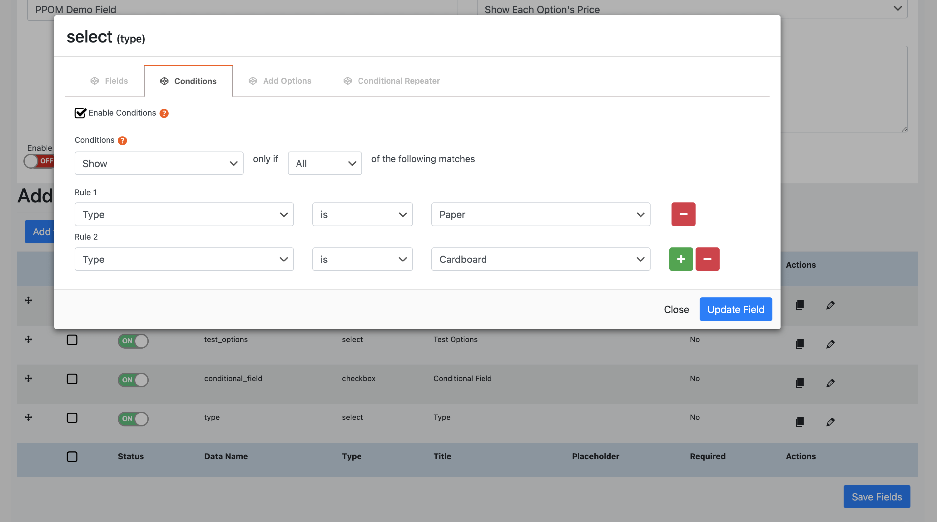 The PPOM fields are very practical for using conditional logic to display specific fields based on other options. To use this, while editing a meta field, click on the Conditions tab. Then, make sure you tick the Enable Conditions box and start preparing the rules: