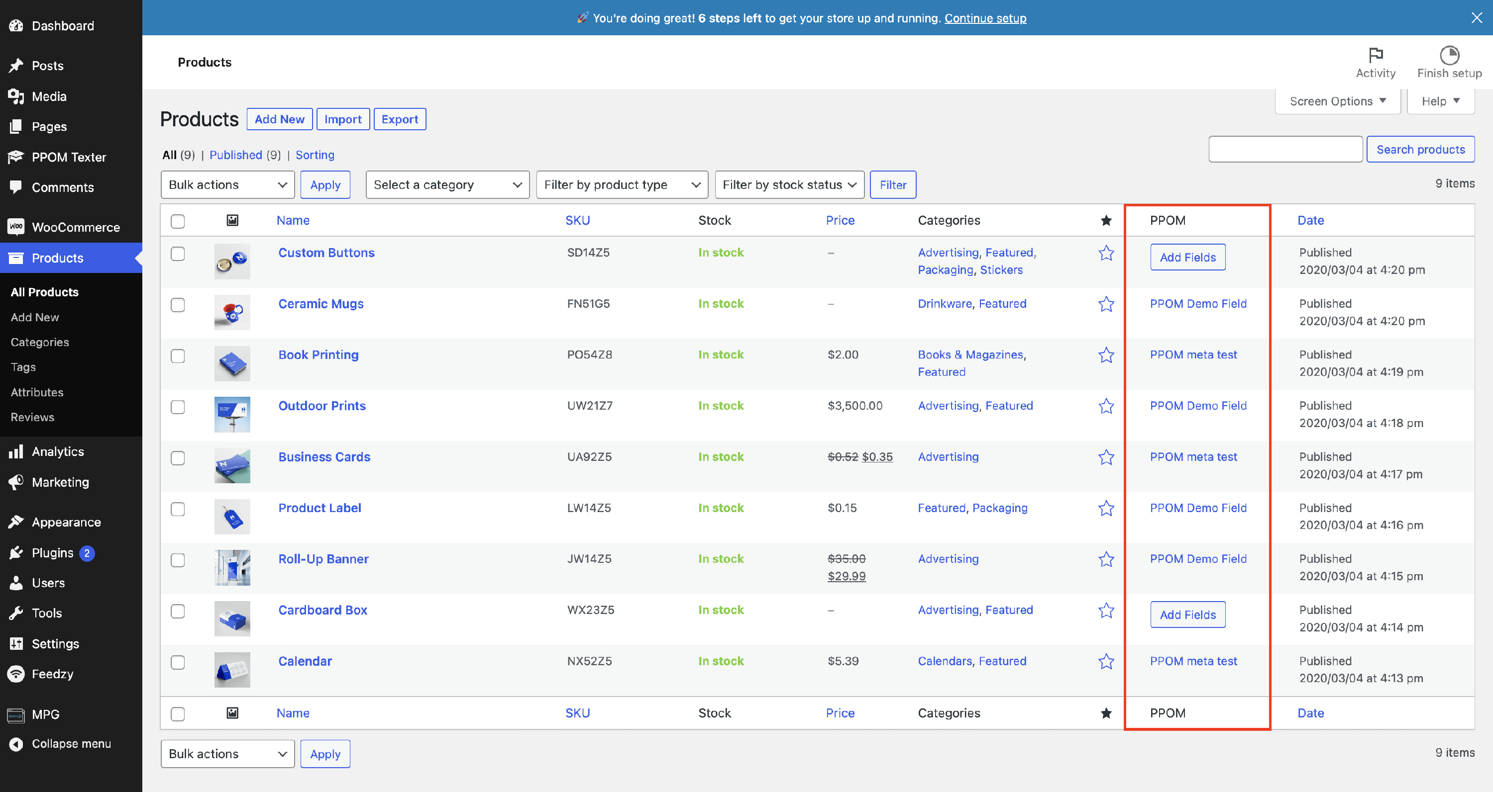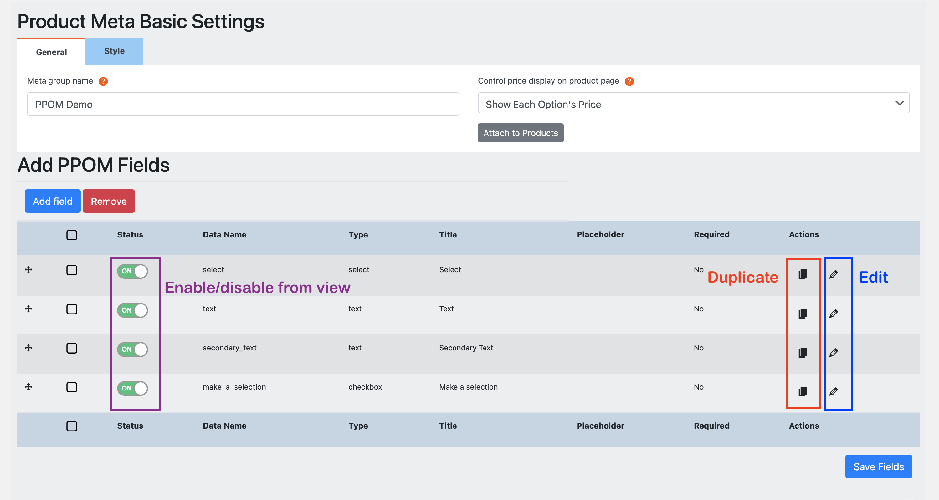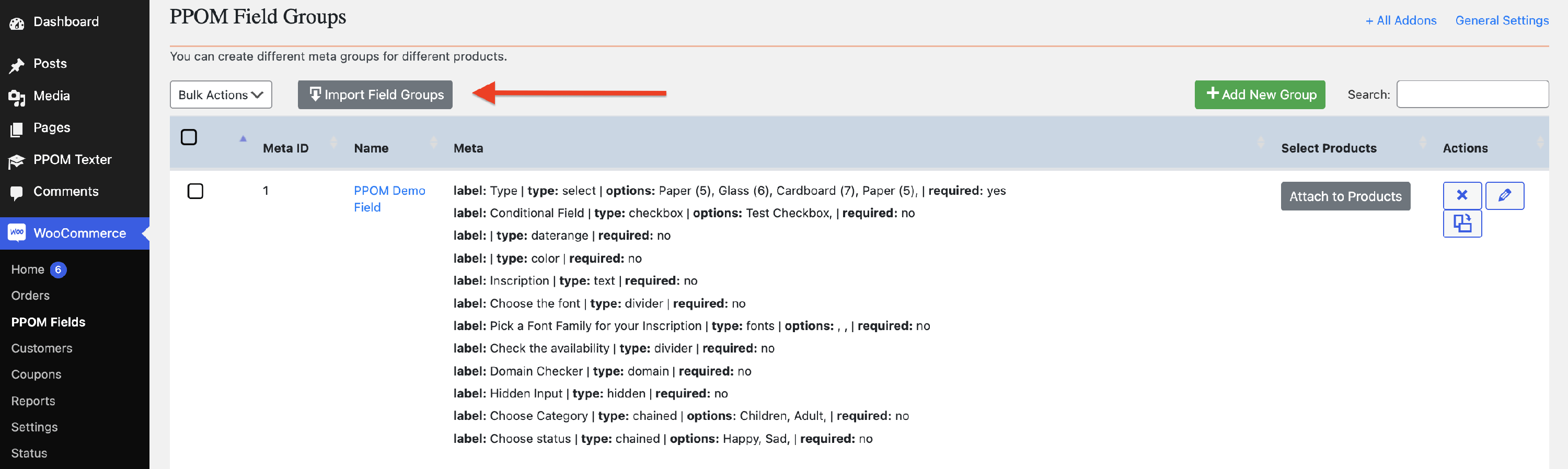 Navigate to Products, and you will observe the PPOM column. After clicking on the Add Fields button, you will be redirected to the PPOM Field Groups panel, where you can use the buttons to assign meta groups to specific products.