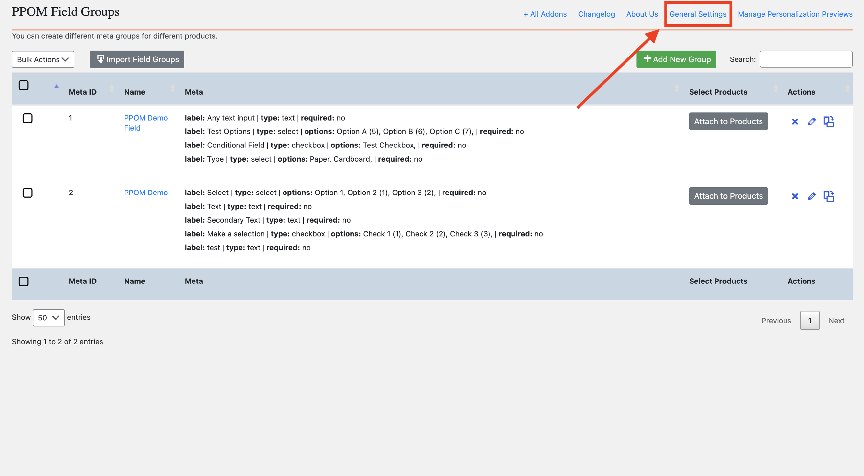 To access PPOM's global settings, go to Dashboard > WooCommerce > Settings > PPOM Settings or click the General Settings button on the PPOM Field Groups page.
