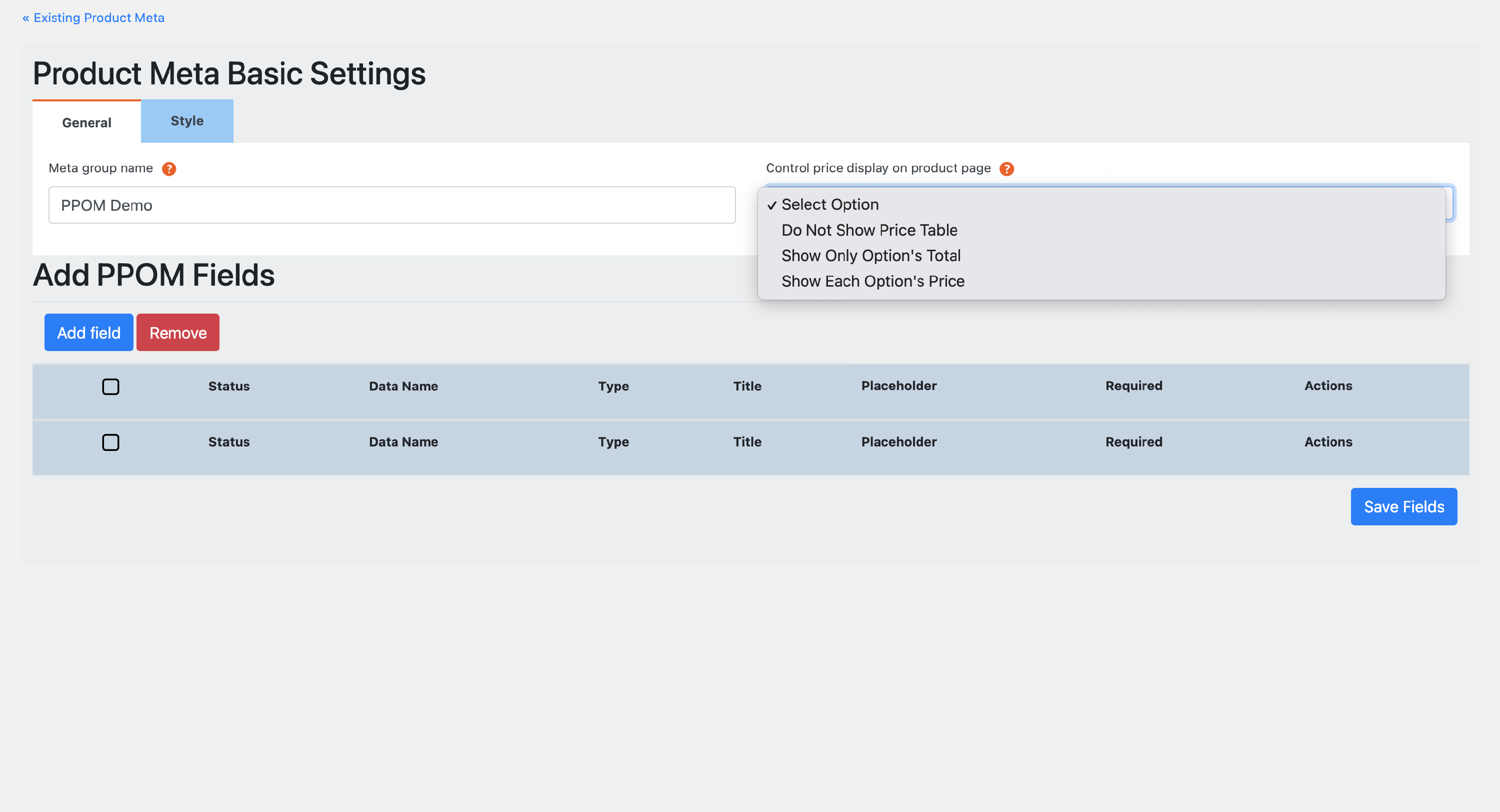 3 Start configuring the meta group by adding fields and picking an option for the price display.