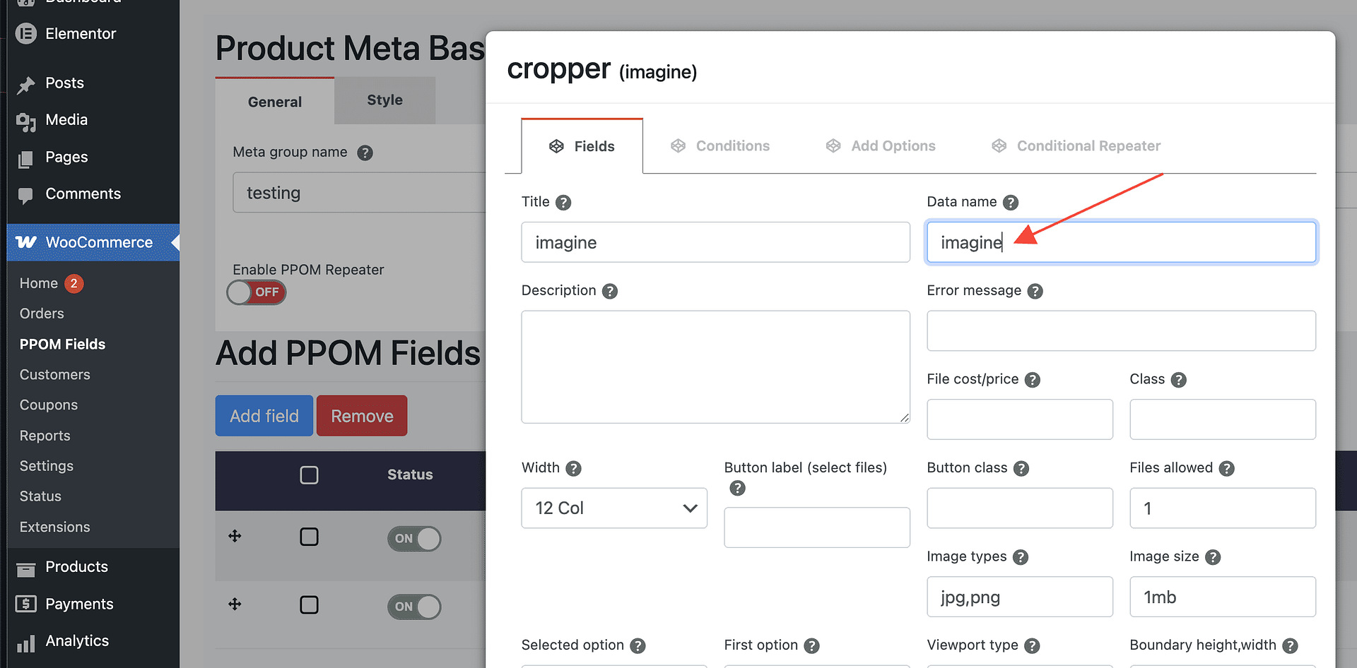 The Data name is set when you create or edit a PPOM field inside a meta group.