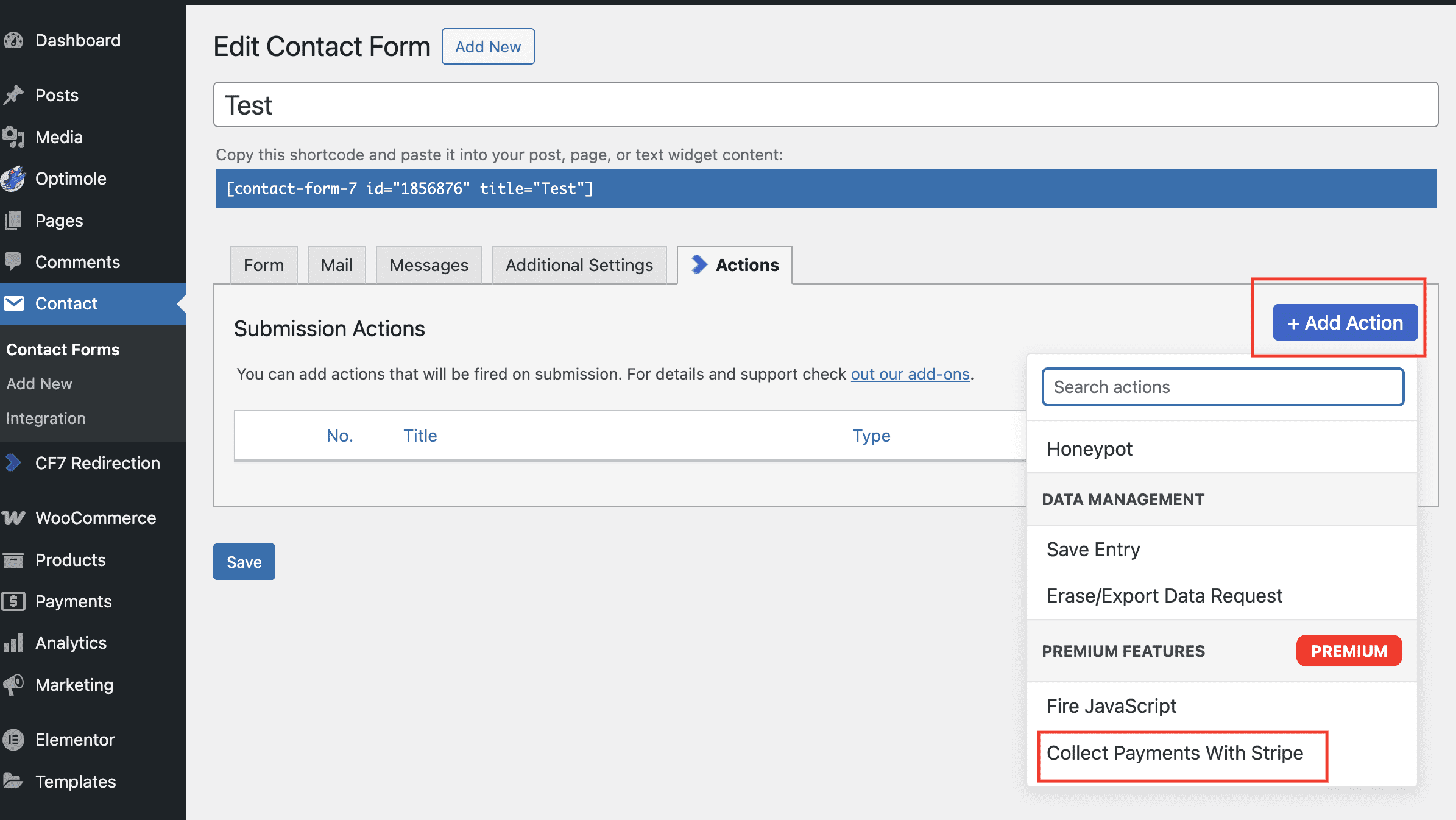 - Click on the Add Action button and choose the Collect Payments With Stripe action.
