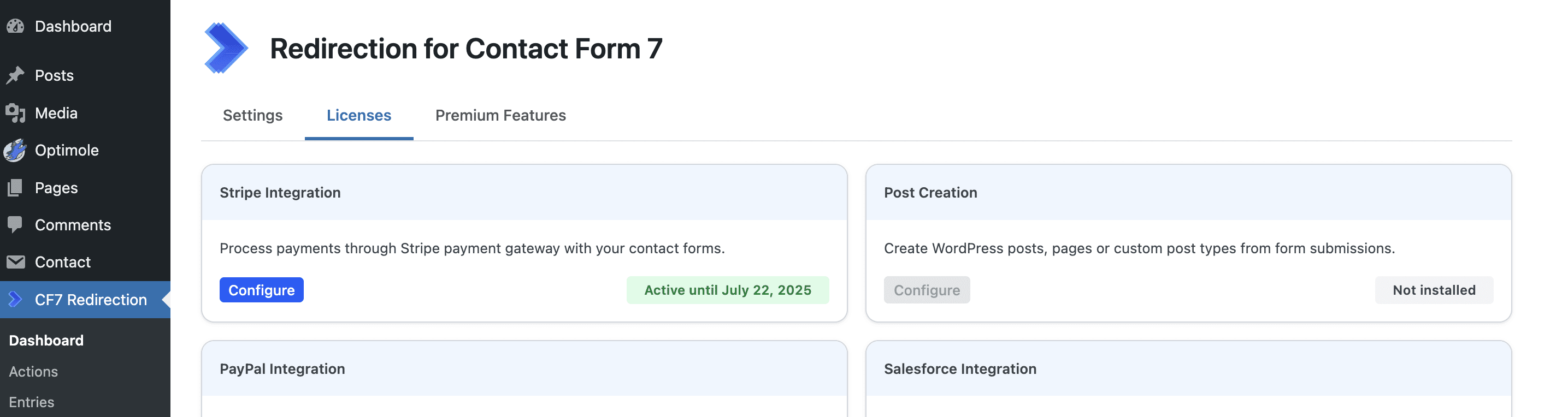 - In your WordPress dashboard, navigate to CF7 Redirection > Dashboard > Licenses and activate the license. ( The license is also available in your purchase history ).
