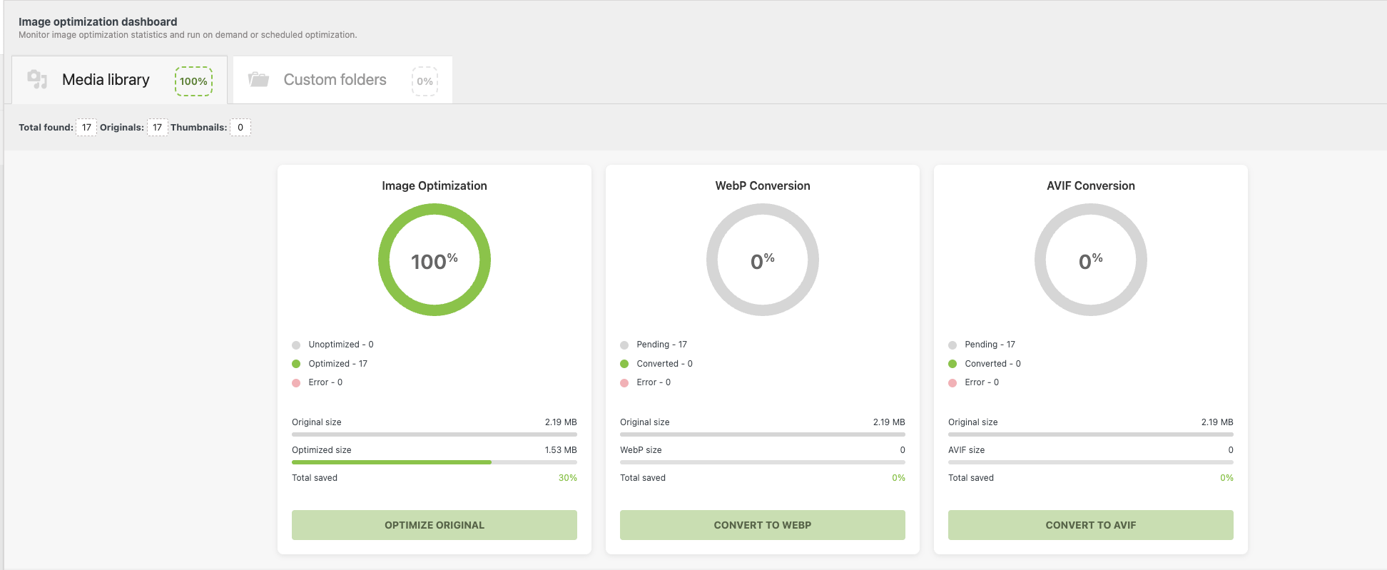 - Optimization status for originals, WebP, and AVIF