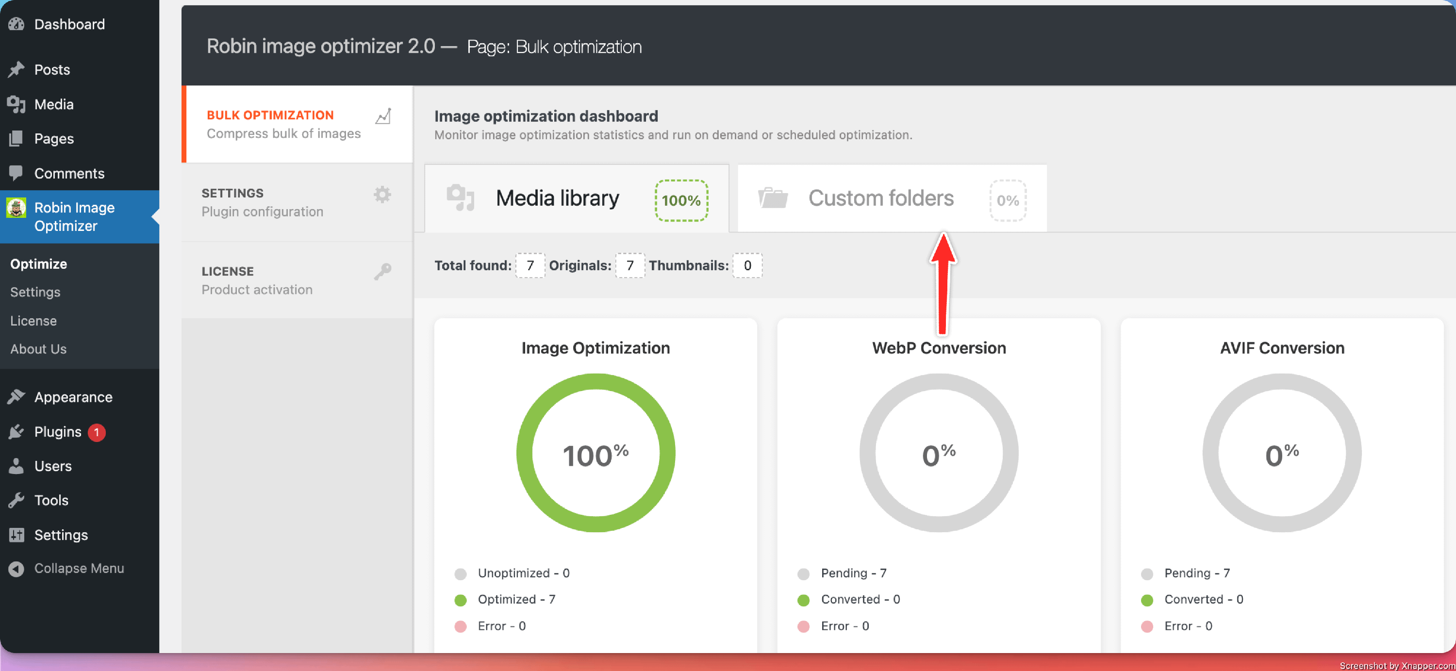 The "Custom folders" option can be enabled by going to the WordPress dashboard > Robin Image Optimizer > Optimize > Custom folders.