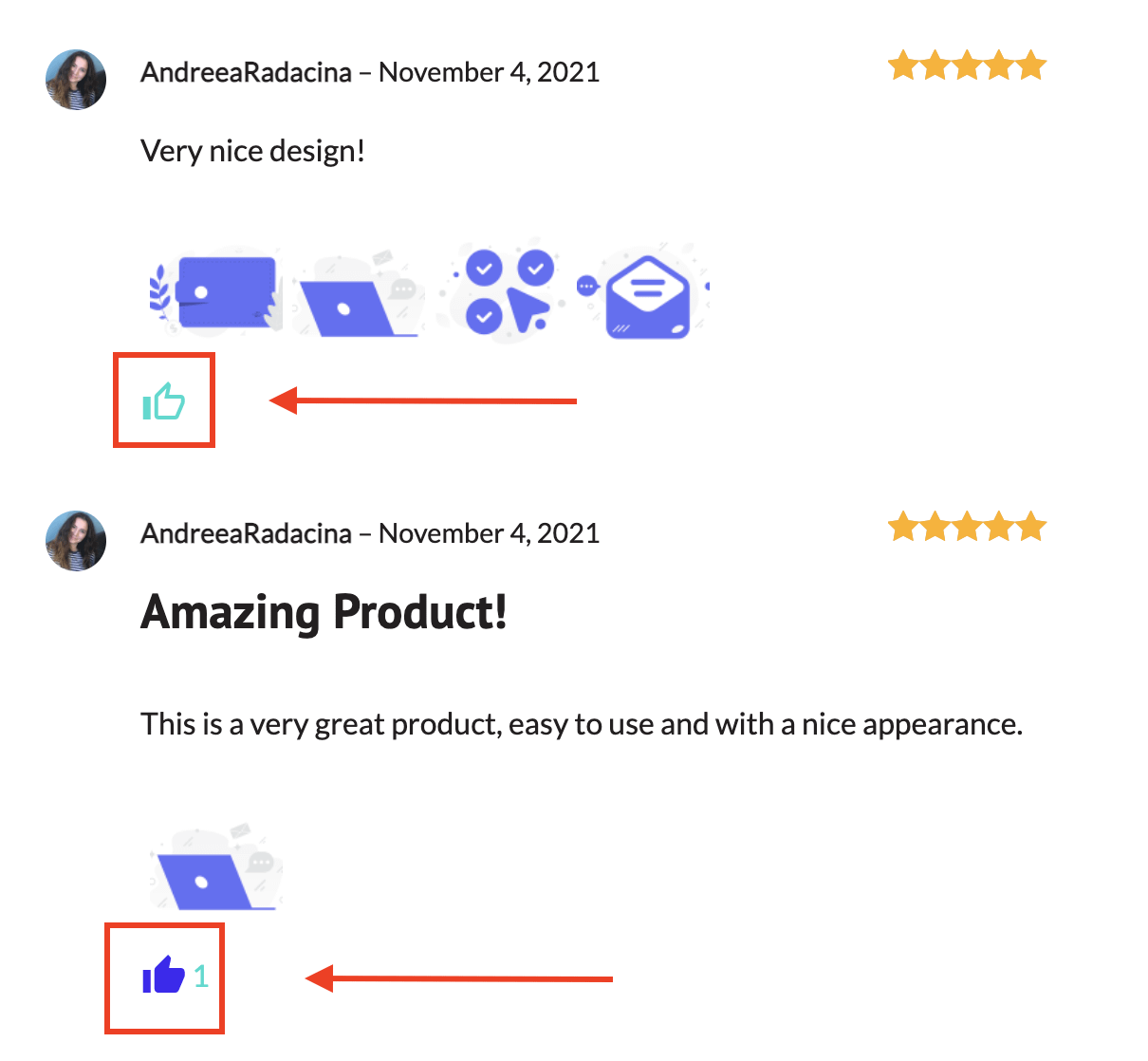 - Enable review voting - the vote is represented by an 👍 icon. It also holds the number of appreciations.