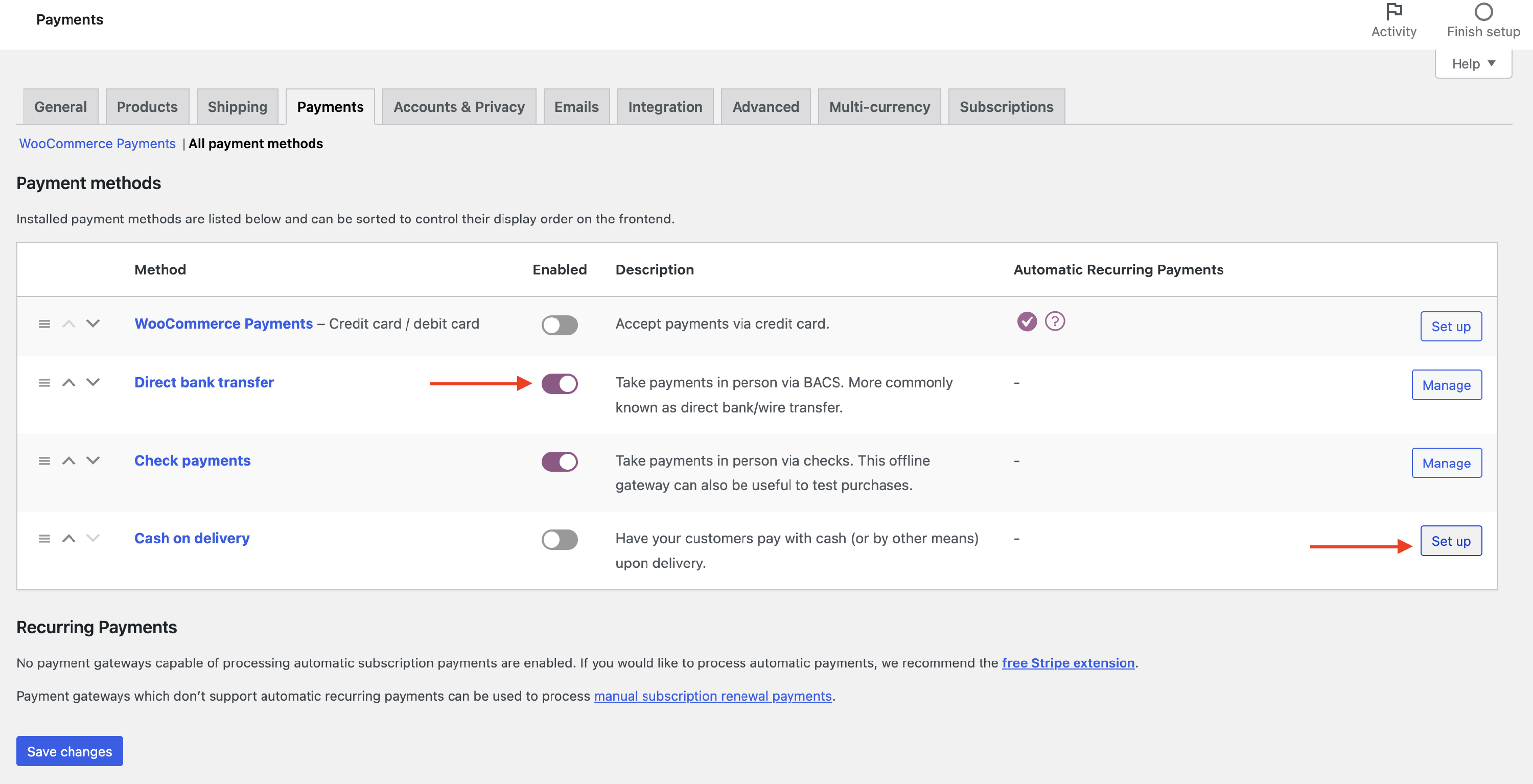 3 To use a certain payment method, just enable it, and then all you have to do is to configure it by clicking on the Set up button.