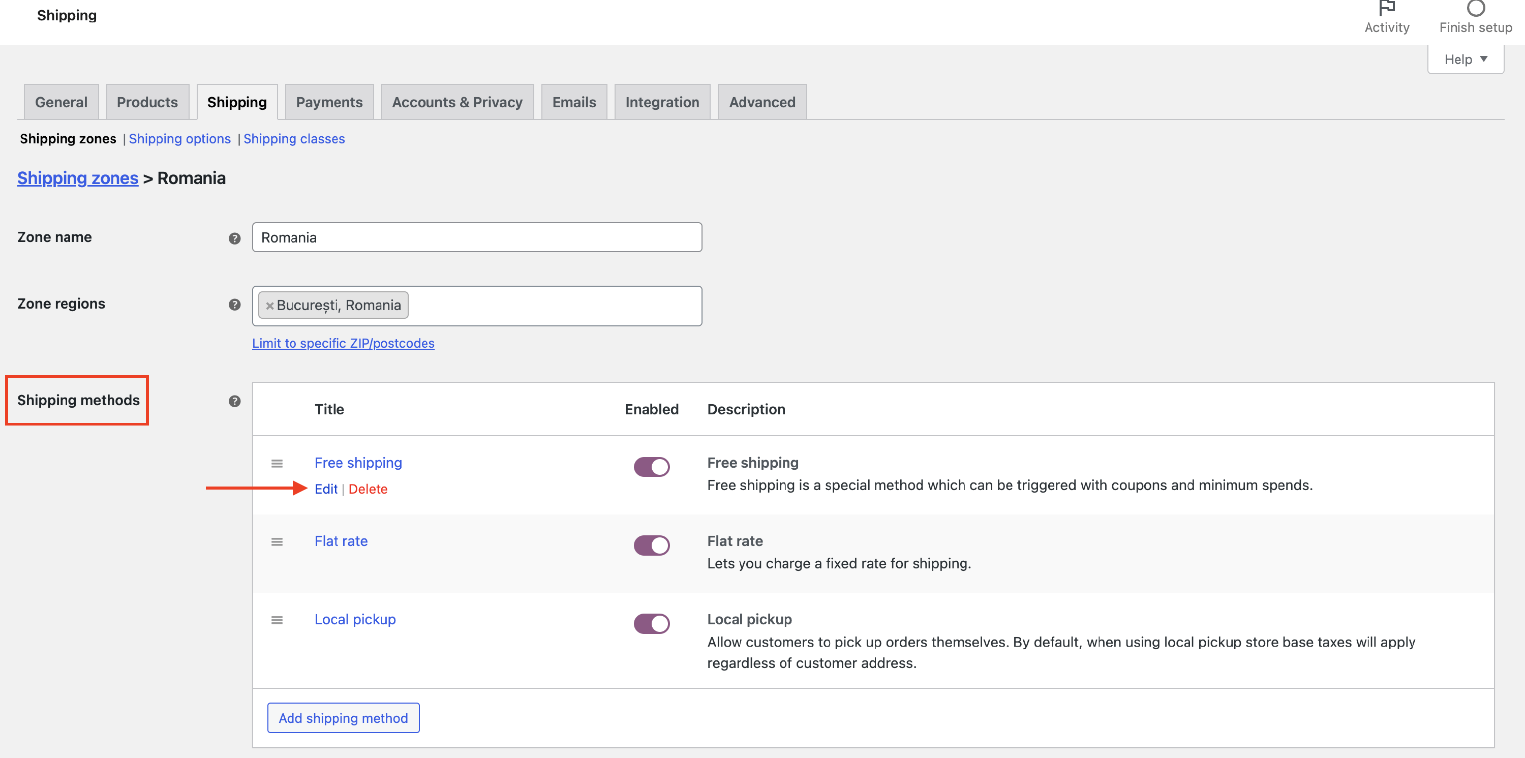 4 Now, you will be able to see them in the Shipping methods area. You can customize their order, enable or disable them, and also access their specific options by clicking on the Edit button.