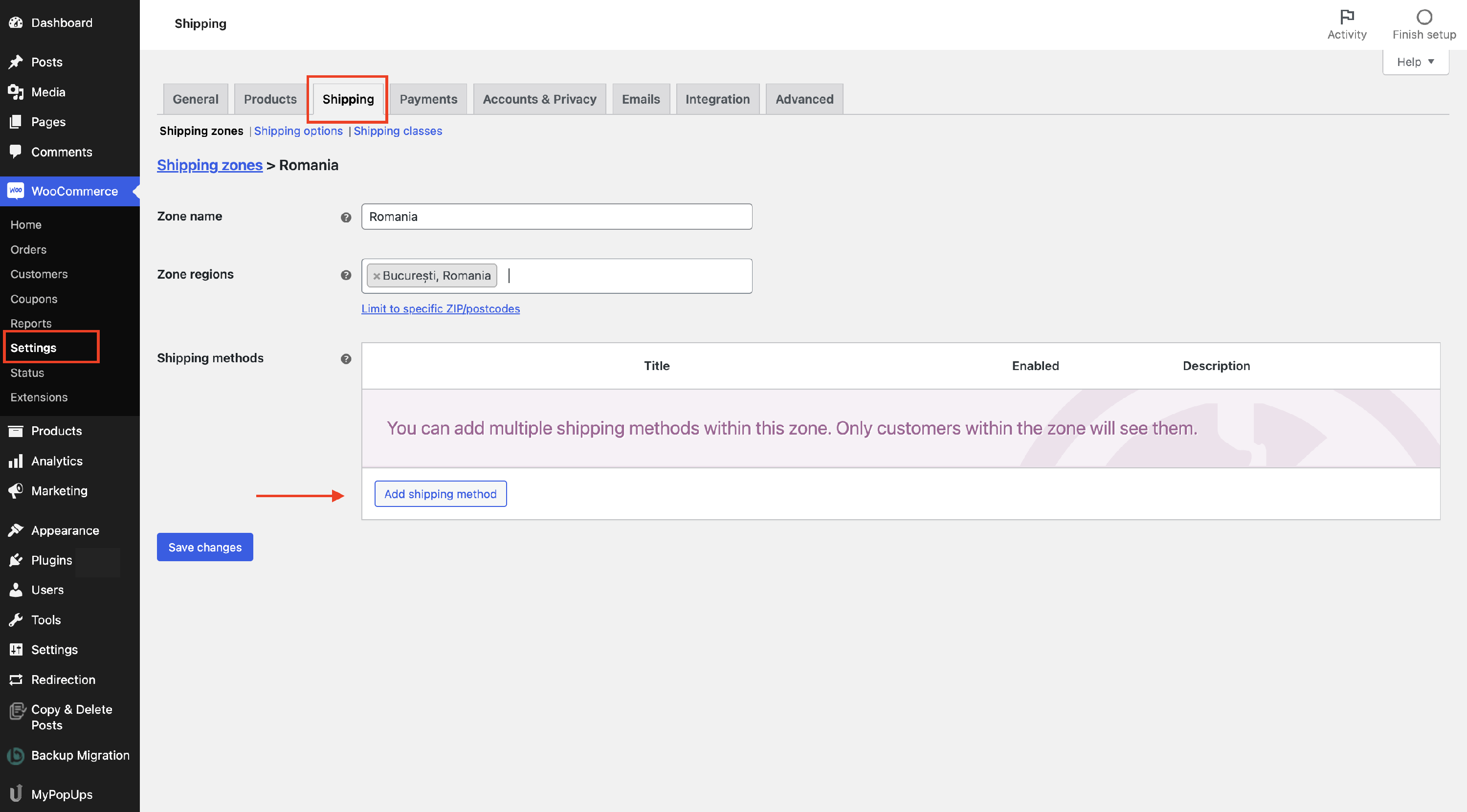 2 From there, click to add a shipping zone. You will be redirected to a new page where you will have to fill in the details. After finishing, click on Add shipping method.