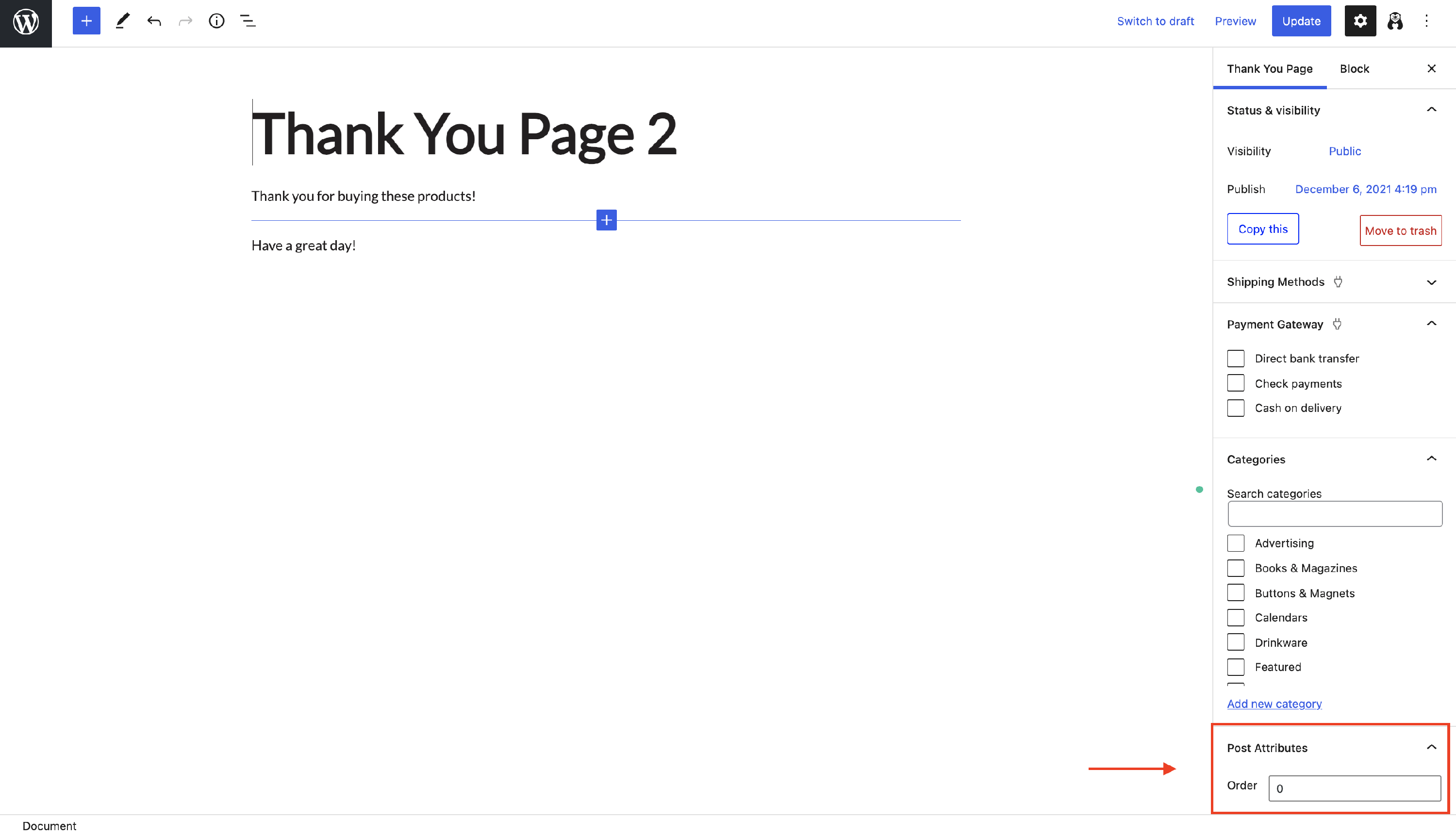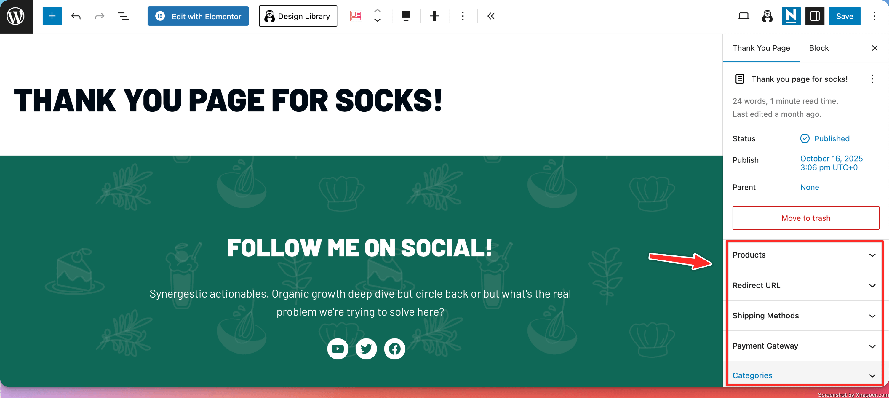 The Gutenberg editor is enabled for editing the Thank You Page, with all its options. More than that, the page comes with specific settings: