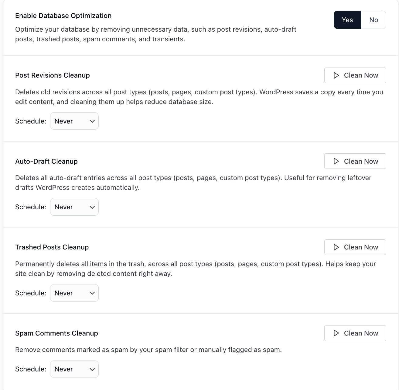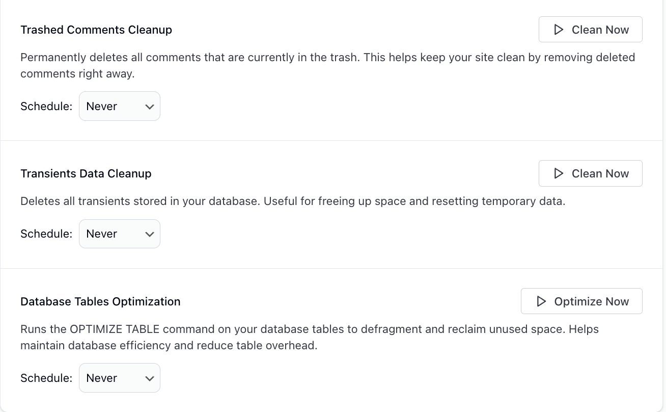 Once enabled, you’ll be able to perform the following optimizations either manually (using the Clean Now button) or on a scheduled basis.