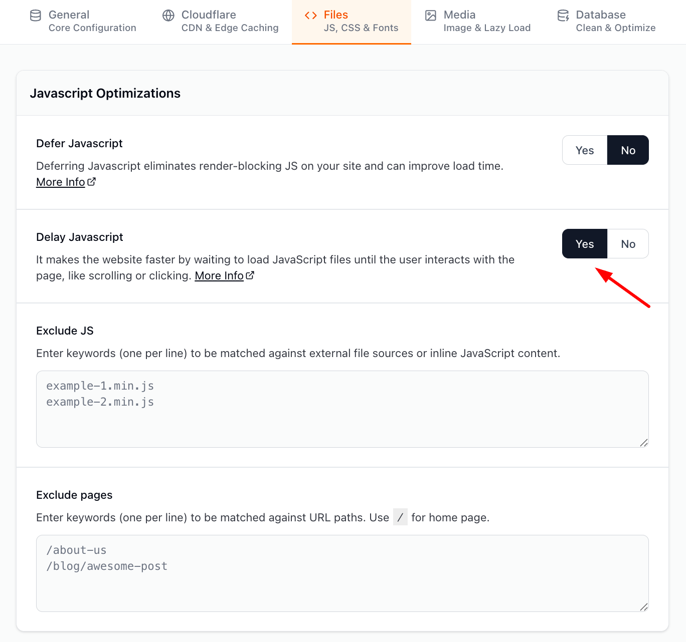 - Navigate to Files tab and enable the Delay JavaScript option.