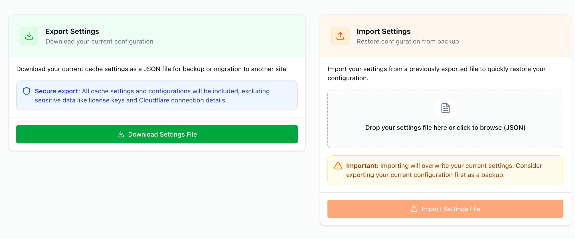 - Navigate to Super Page Cache > Import/Export in the WordPress menu.