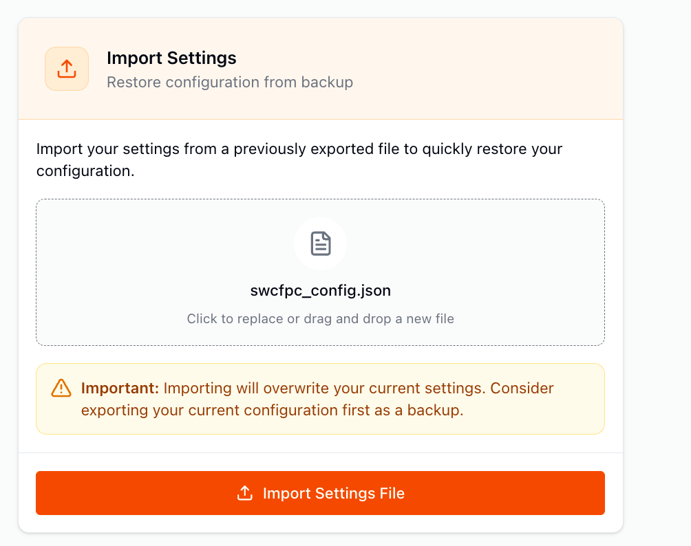 swcfpc_config.jsonfile and click Import Settings file to apply the configuration.