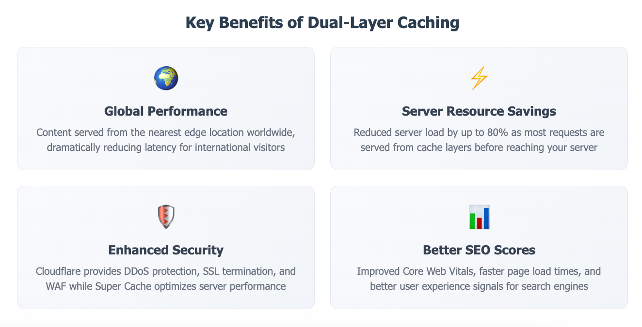 Congratulations! You've successfully integrated Cloudflare with Super Page Cache. Your website should now benefit from global edge caching combined with optimized server-side caching, resulting in significantly improved performance for visitors worldwide.