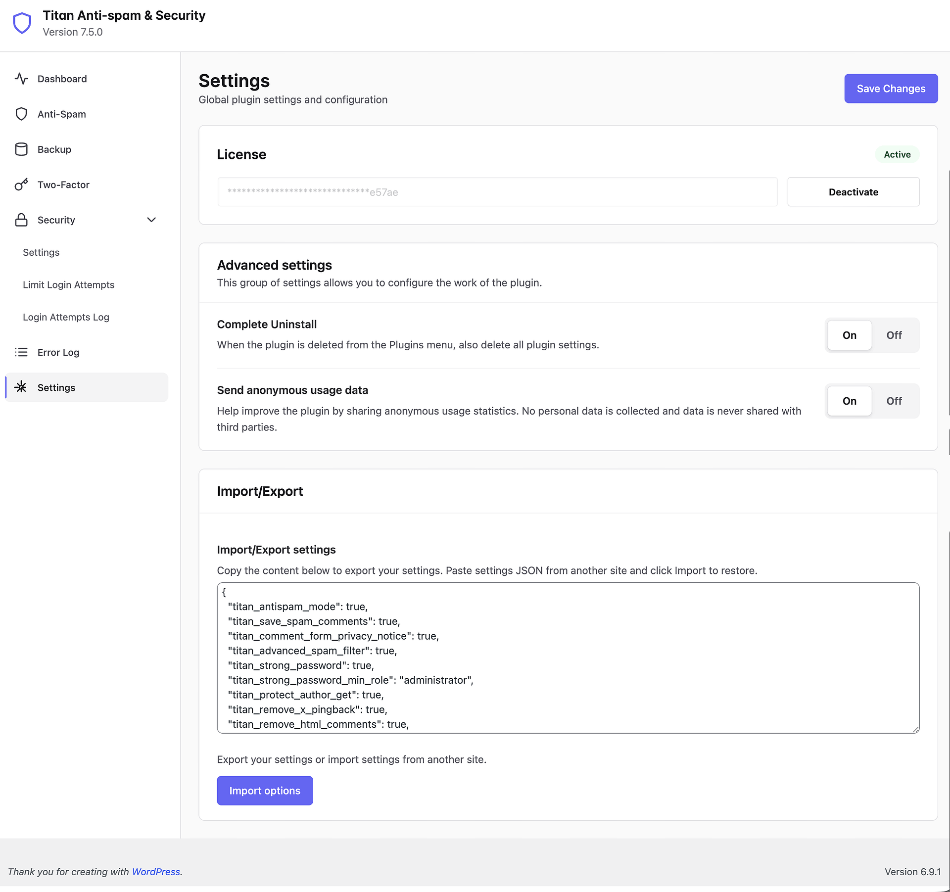 To export your settings: Copy the JSON content from the text area and save it somewhere safe, or paste it into the same field on another WordPress site running Titan.