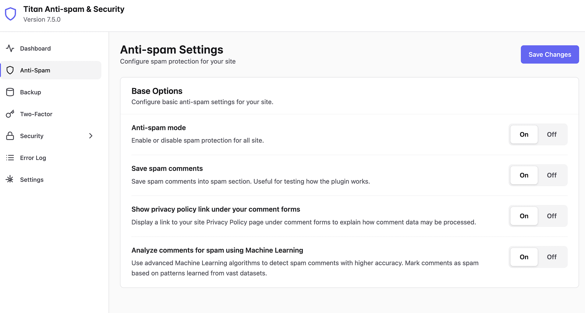 Enable or disable spam protection for all site. This is the main toggle that activates Titan's anti-spam engine. When turned on, the plugin automatically filters spam across your WordPress installation without requiring visitors to solve CAPTCHAs.