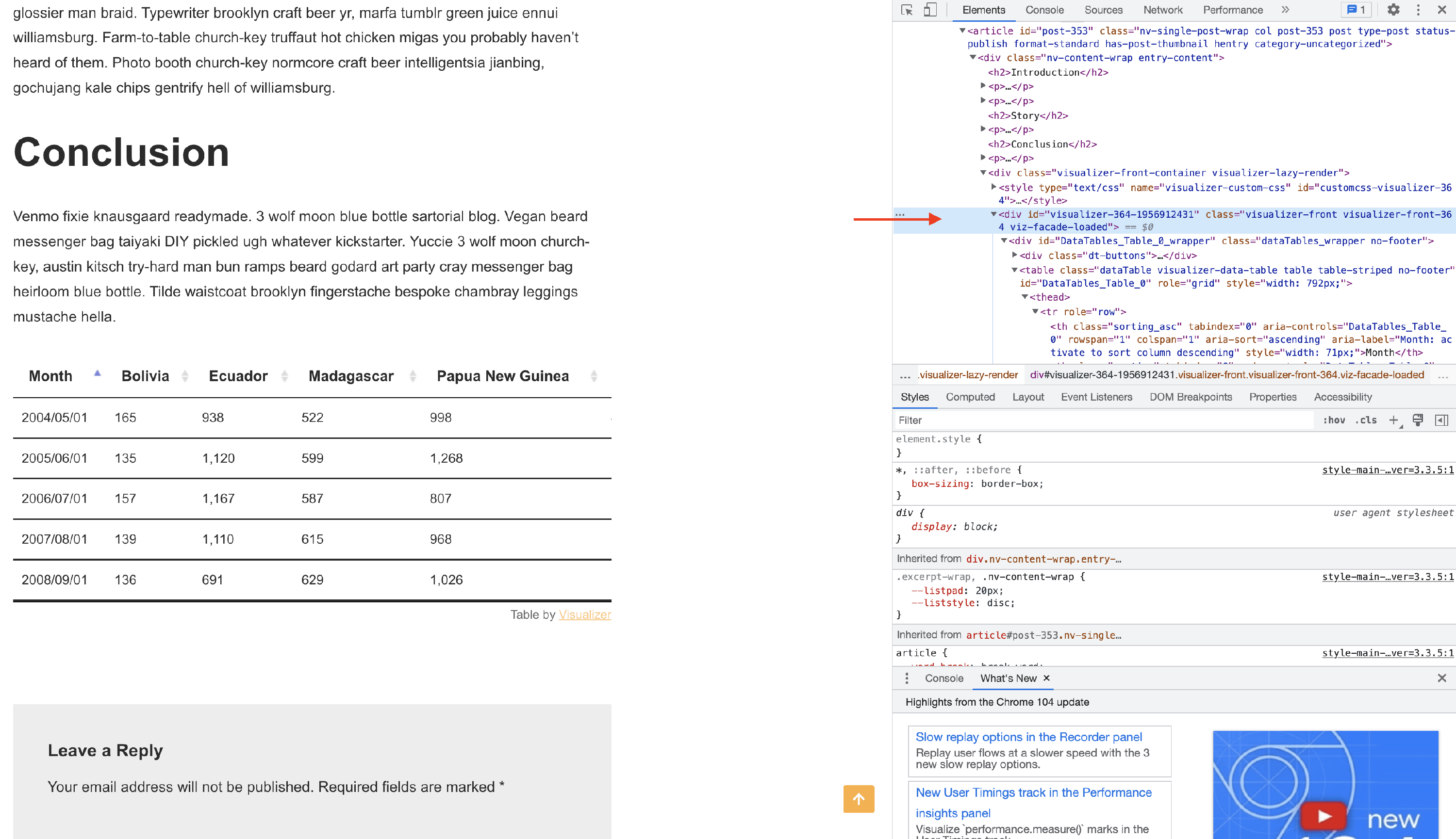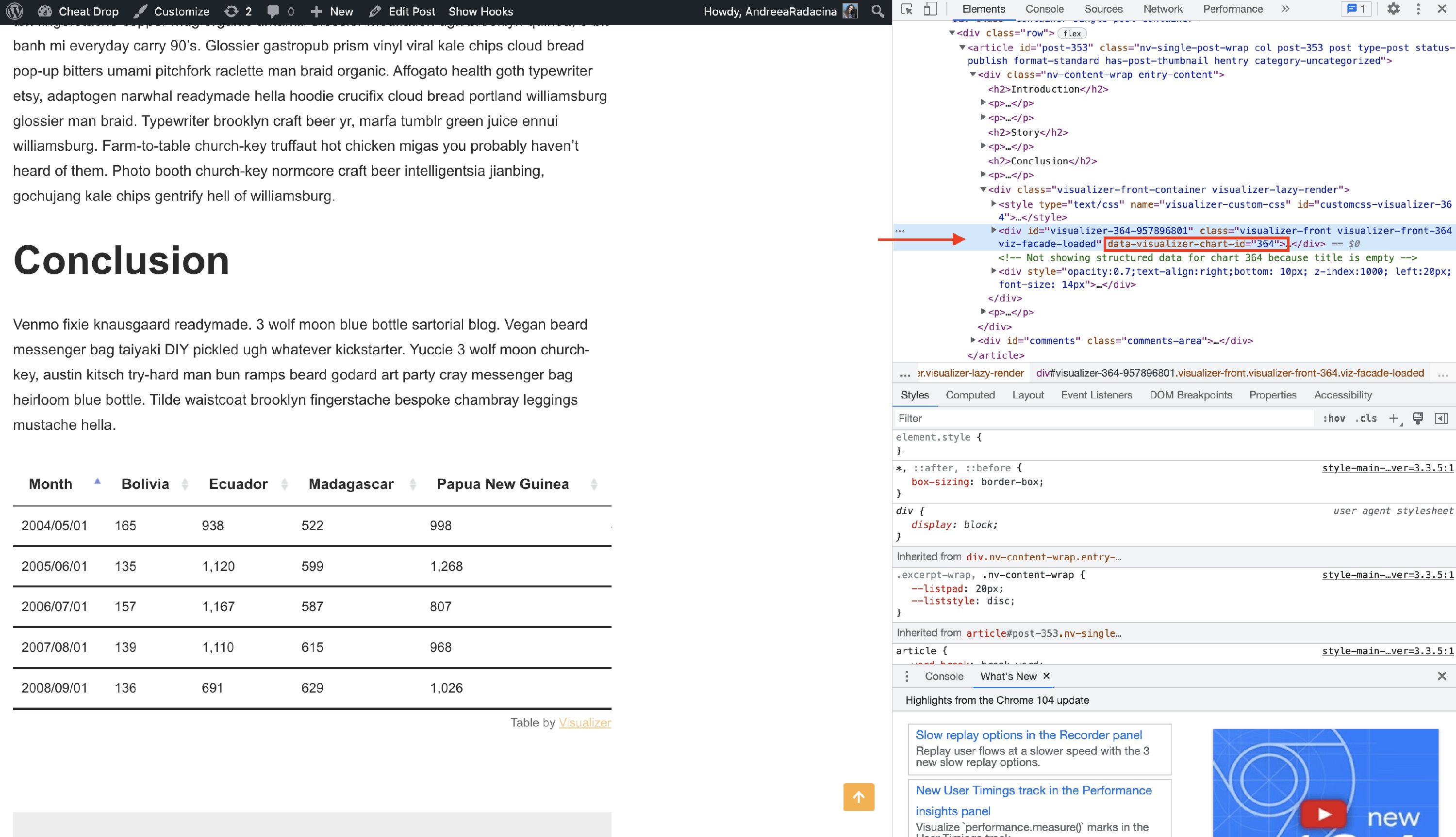 Any Visualizer charts have a specific chart ID that can be rendered on the post where the chart was added. This can be done by enabling some of the Frontend Actions or adding a custom code. This article will present the second method of adding the Chart ID.