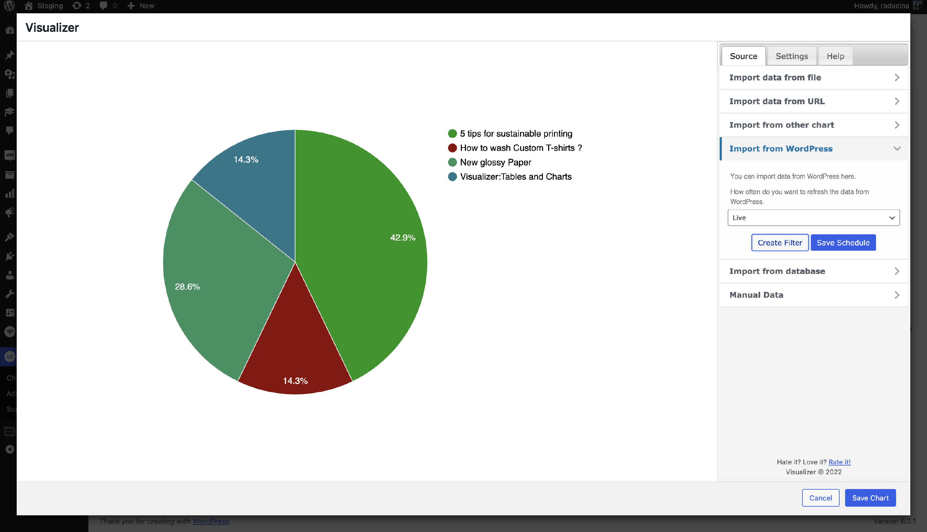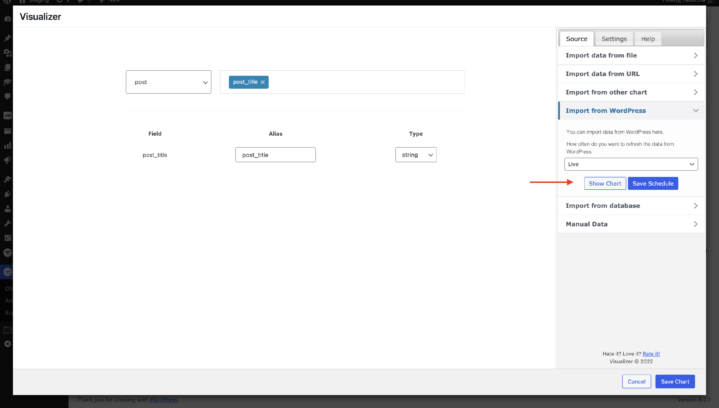 1 While editing a chart, navigate to the Source tab and click on I mport from WordPress.