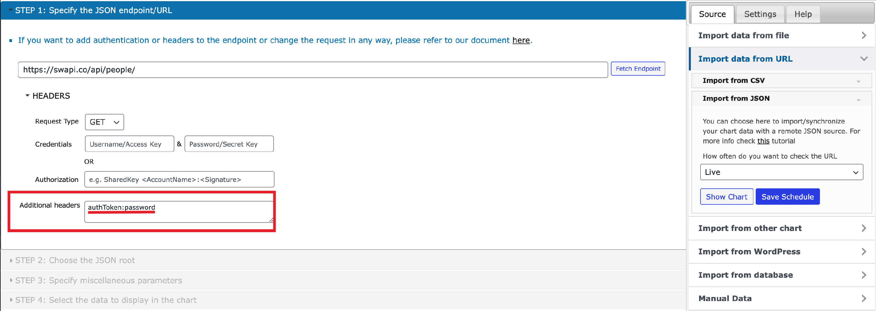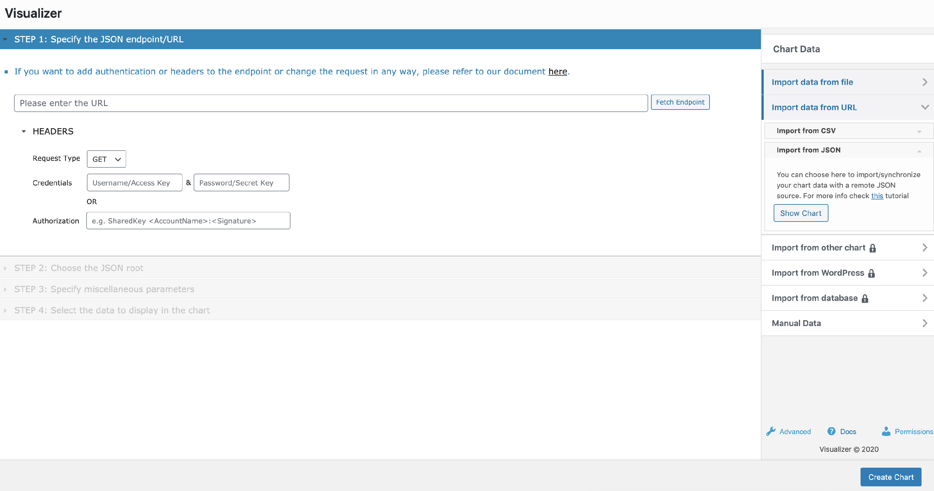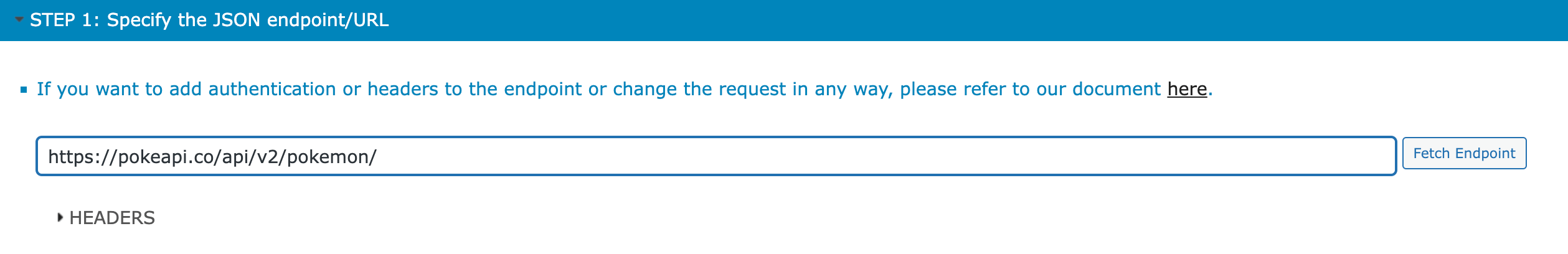 Visualizer has support for authentication for JSON imports. Clicking on HEADERS will open some new fields where you can enter the details needed for authentication for that specific JSON. In this case, make sure you click on Fetch Endpoint after the authentication fields are completed.
