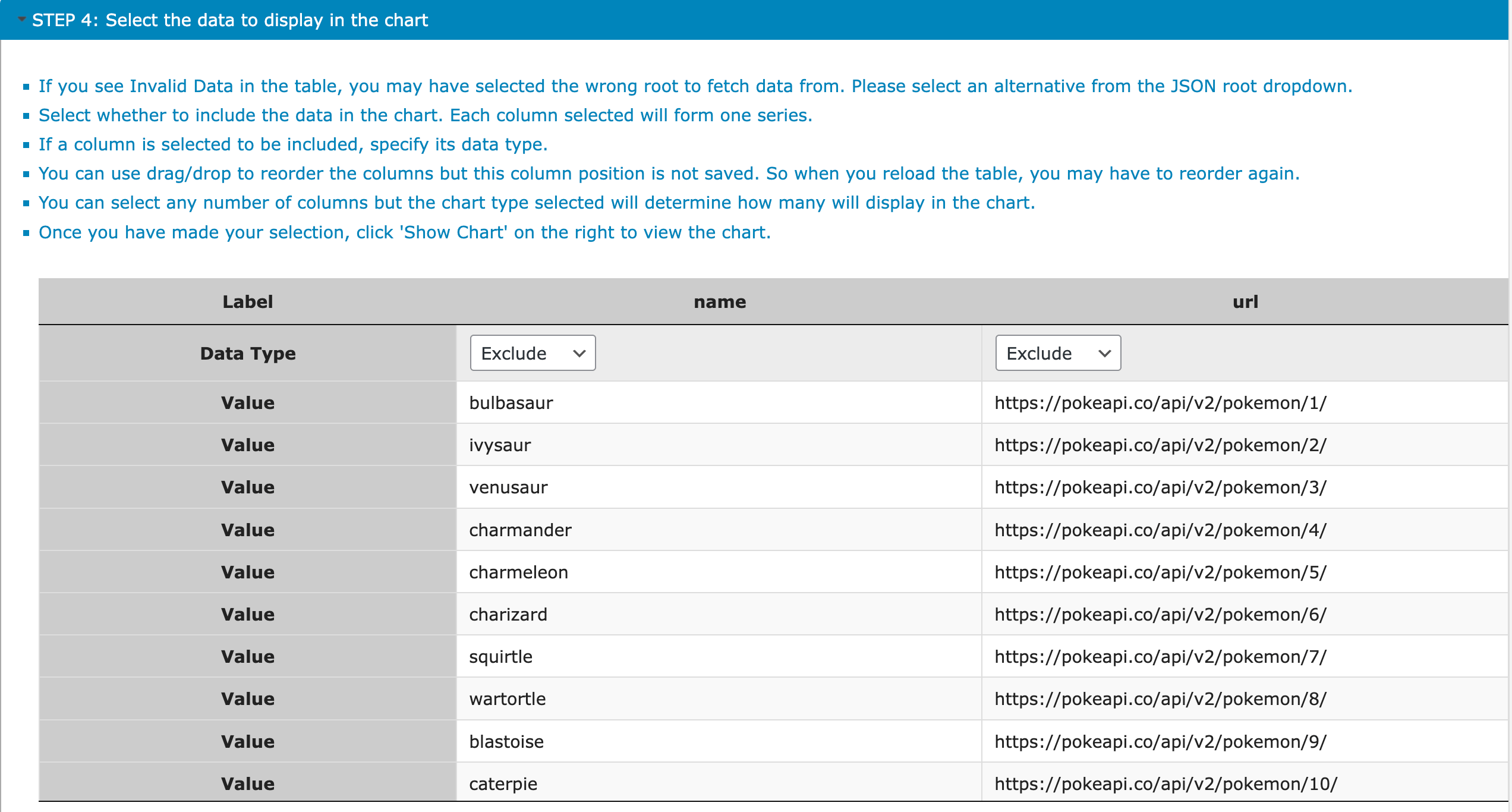 }<br>Once you pick the columns you want to show, clicking on Save & Show Chart will show you the chart: