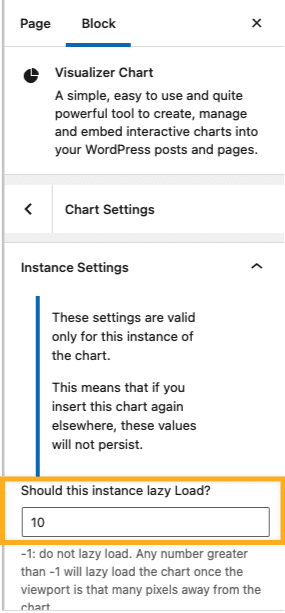 The Visualizer block provides the option for enabling the lazy load option under the Instance Settings, as shown in the below screenshot.