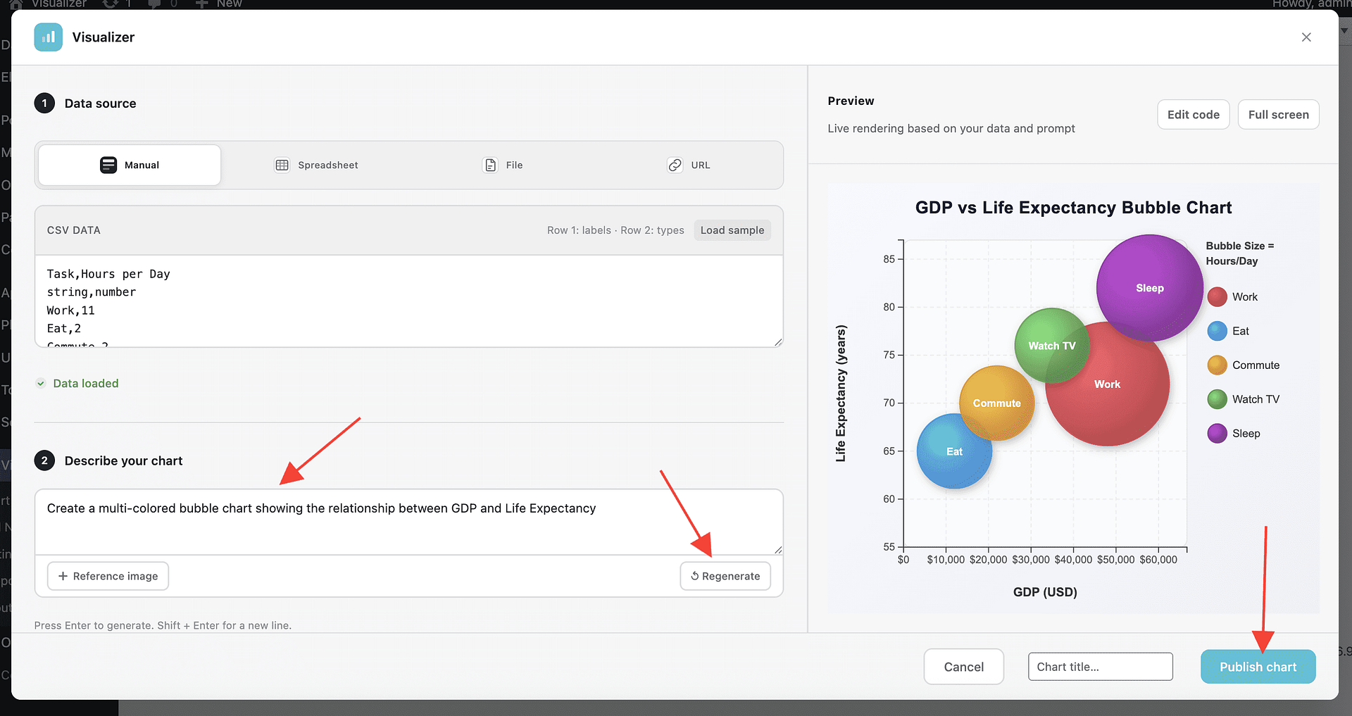 Visualizer v4.0.0 introduces the AI Chart Builder, a new way to create custom charts using plain-language prompts. Powered by D3.js, it lets you describe the chart you want and generates it automatically — no coding required.
