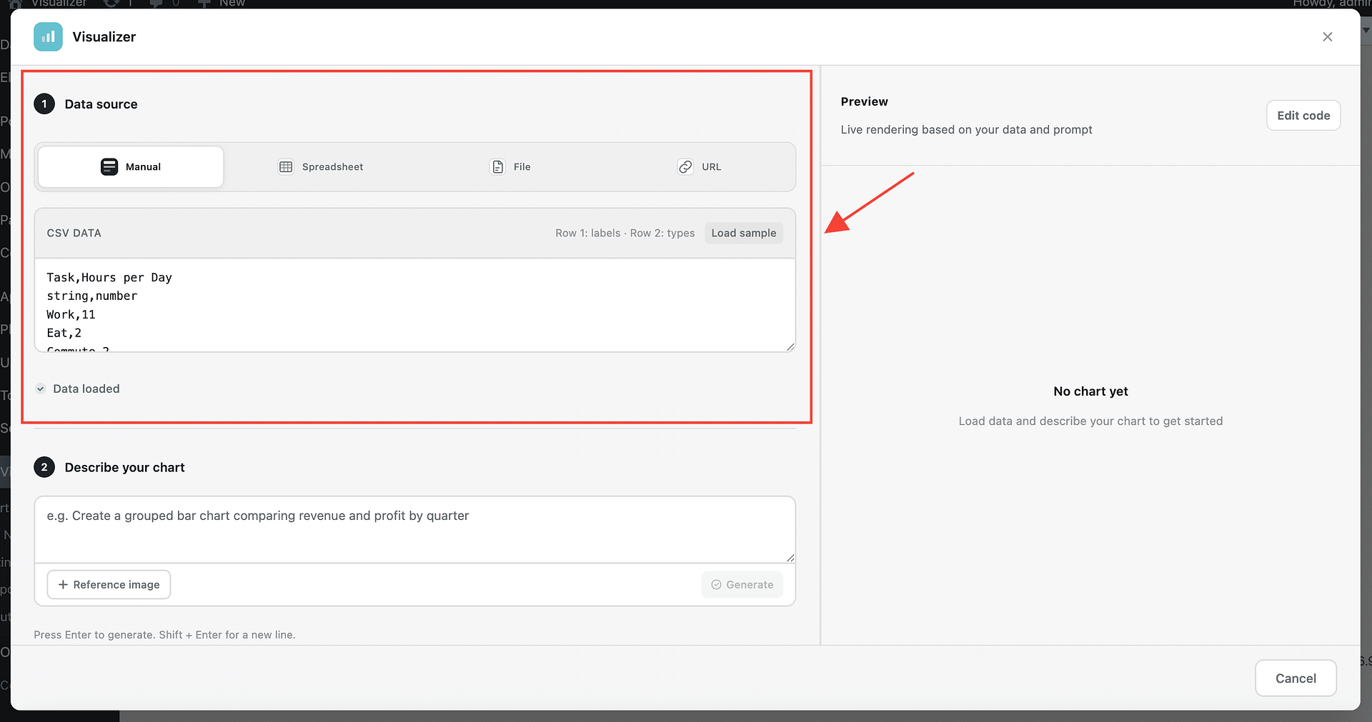 5. In the prompt field, describe the chart you want to create in plain language. Be as specific as you can about chart type, colors, axes, and the relationship you want to visualize.